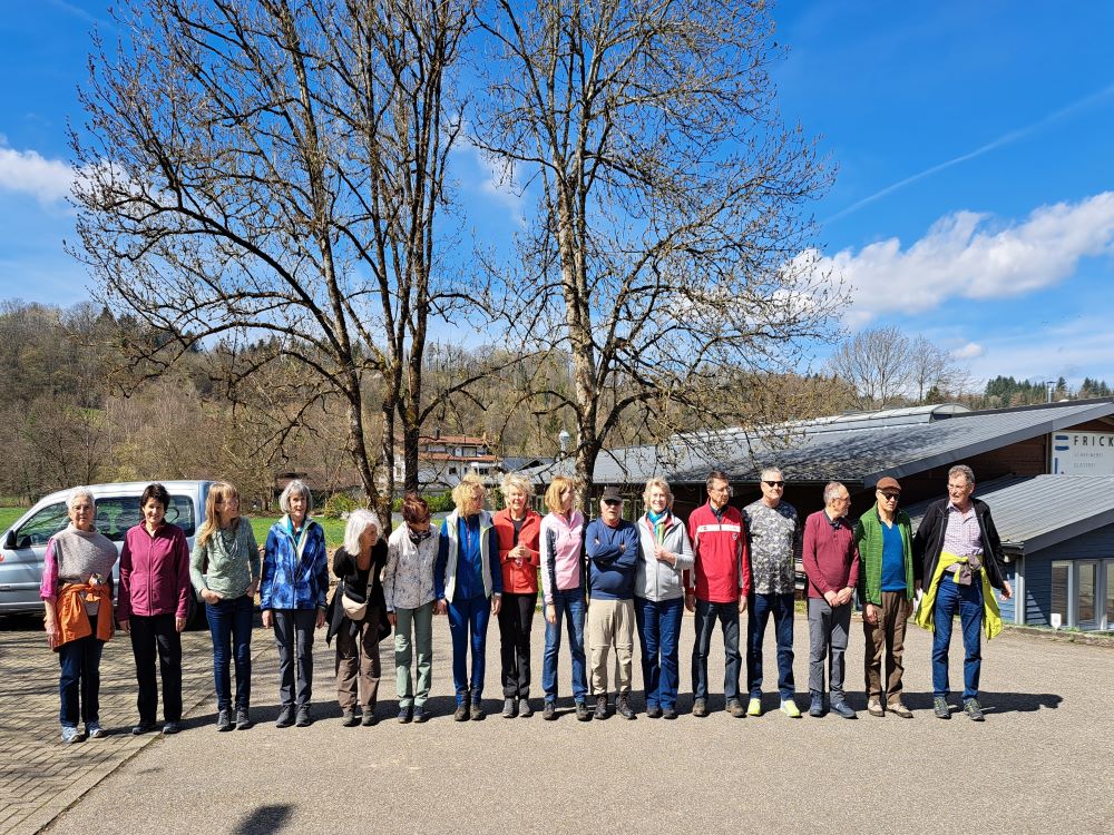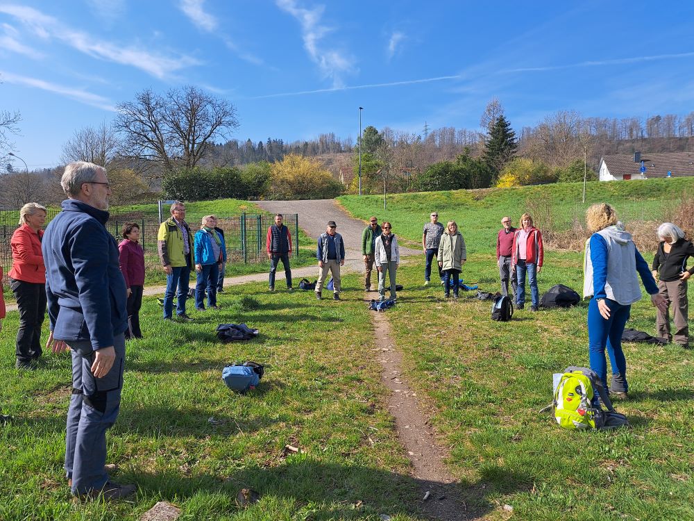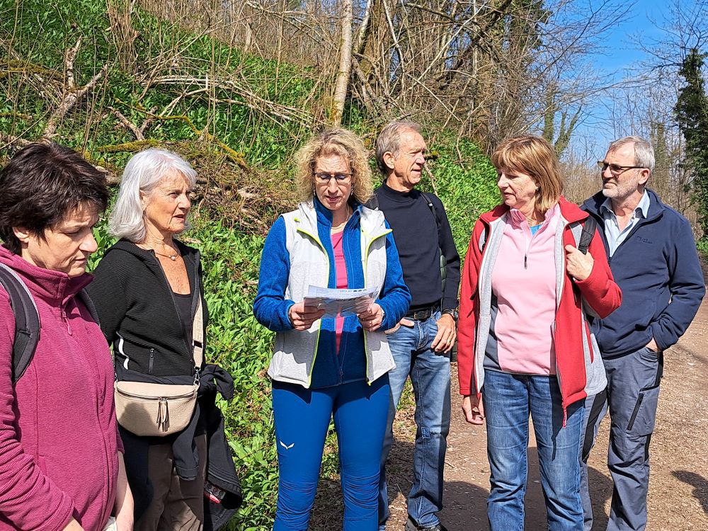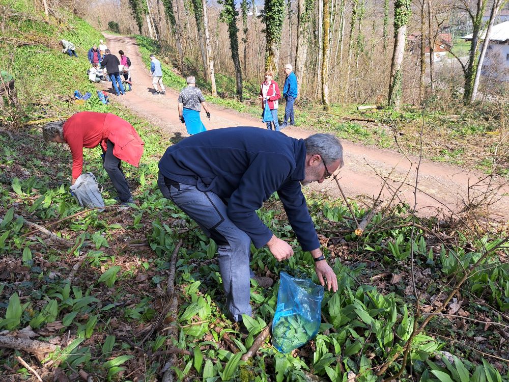 Nach der umweltfreundlichen Anfahrt mit dem Bus erwartete uns unsere Wanderführerin Chantal bereits an der Bushaltestelle Enkendorf. Zunächst gab es eine erste Einheit mit Aufwärm- und Kräftigungsübungen. Ein „Entknotungsspiel“ sorgte für viel Heiterkeit und wurde von uns souverän gemeistert. Gut gelaunt und bei strahlendem Sonnenschein machten sich dann 19 motivierte Wanderinnen und Wanderer auf den Weg. Nachdem wir die Wehra überquert hatten, sammelten wir mit vereinten Kräften auf der Knebelhalde 1 kg Bärlauch. Zuvor wurden wir von Chantal über die vielen positiven Wirkungen dieses „Wundermittels“ aufgeklärt.