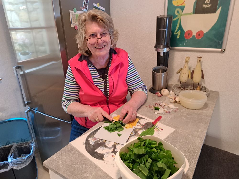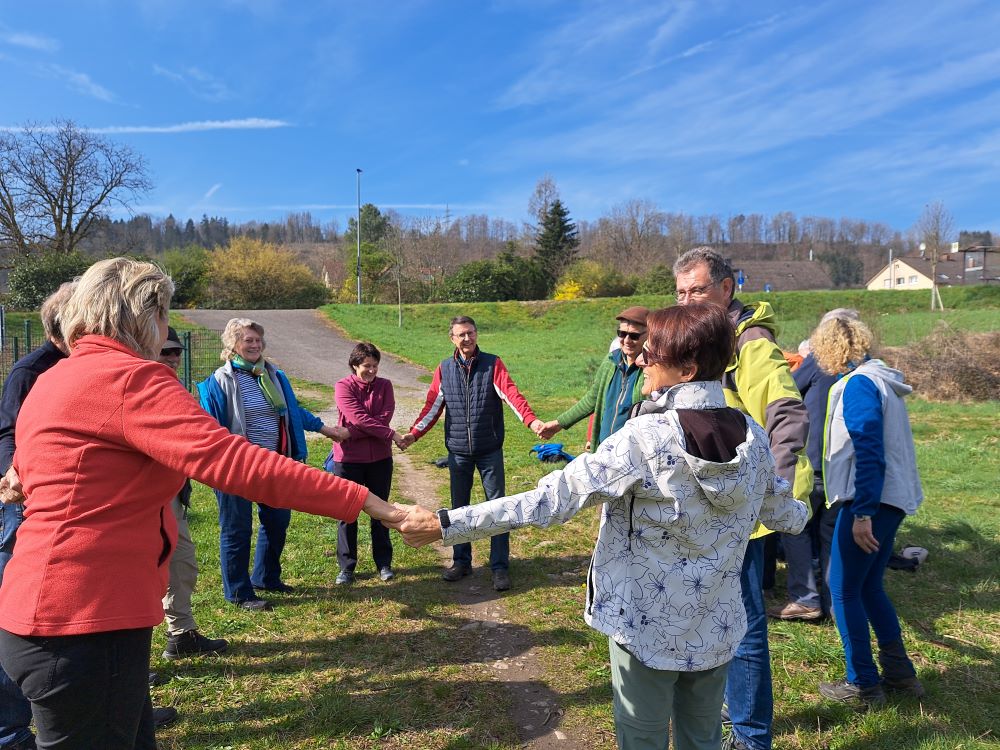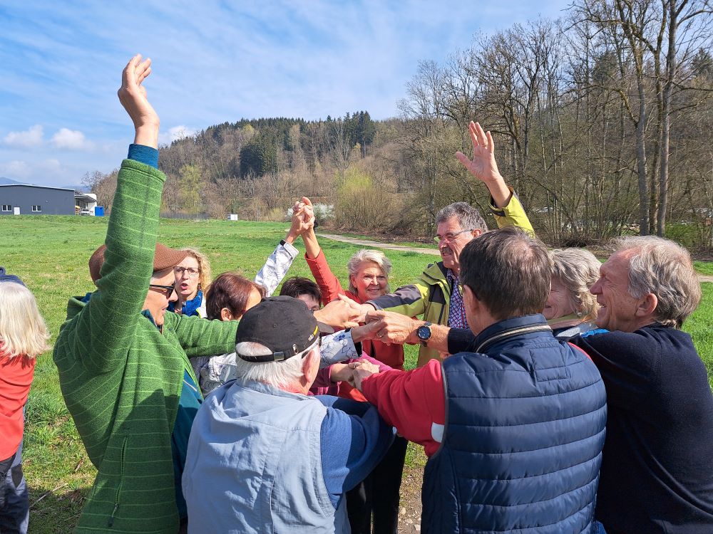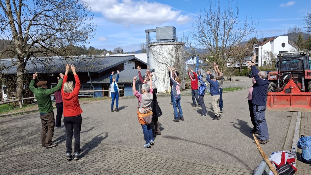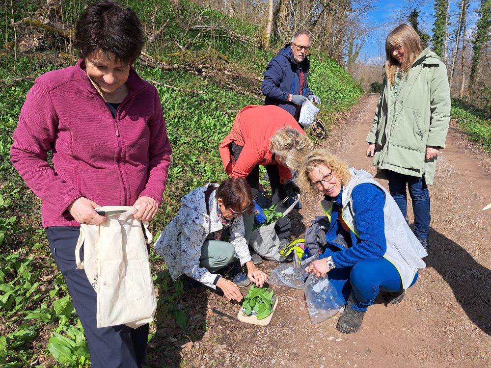 Nach der umweltfreundlichen Anfahrt mit dem Bus erwartete uns unsere Wanderführerin Chantal bereits an der Bushaltestelle Enkendorf. Zunächst gab es eine erste Einheit mit Aufwärm- und Kräftigungsübungen. Ein „Entknotungsspiel“ sorgte für viel Heiterkeit und wurde von uns souverän gemeistert. Gut gelaunt und bei strahlendem Sonnenschein machten sich dann 19 motivierte Wanderinnen und Wanderer auf den Weg. Nachdem wir die Wehra überquert hatten, sammelten wir mit vereinten Kräften auf der Knebelhalde 1 kg Bärlauch. Zuvor wurden wir von Chantal über die vielen positiven Wirkungen dieses „Wundermittels“ aufgeklärt.