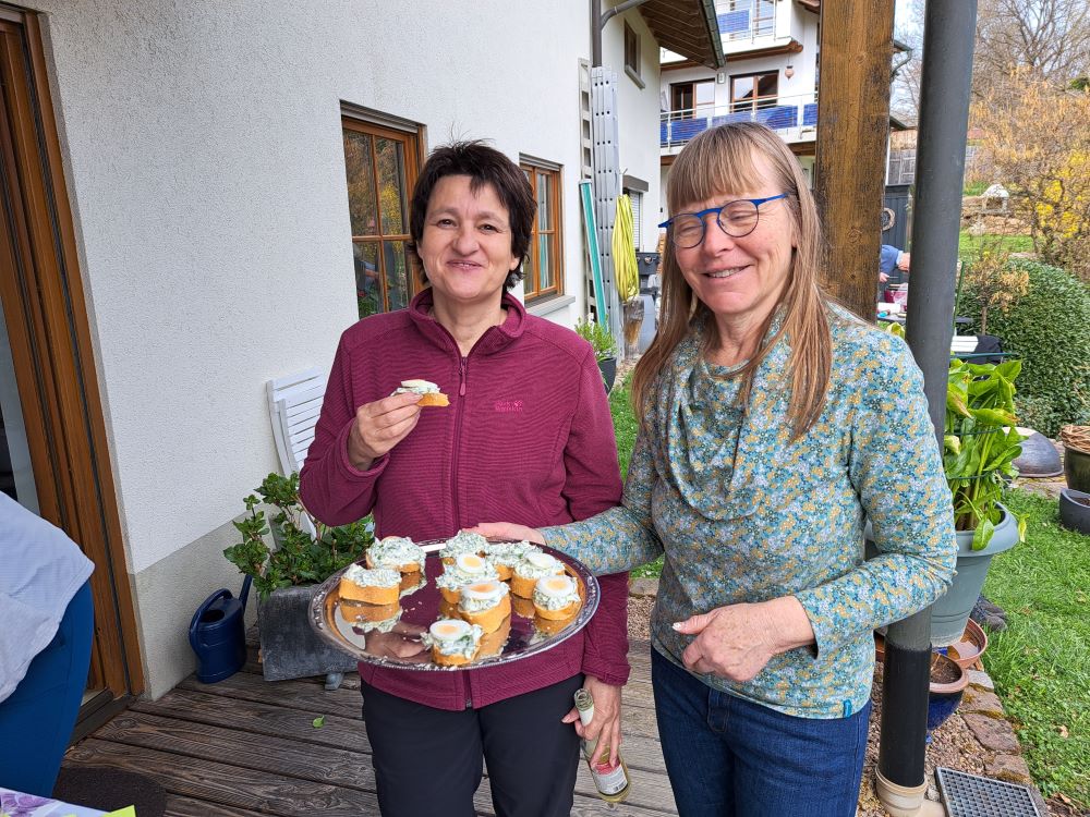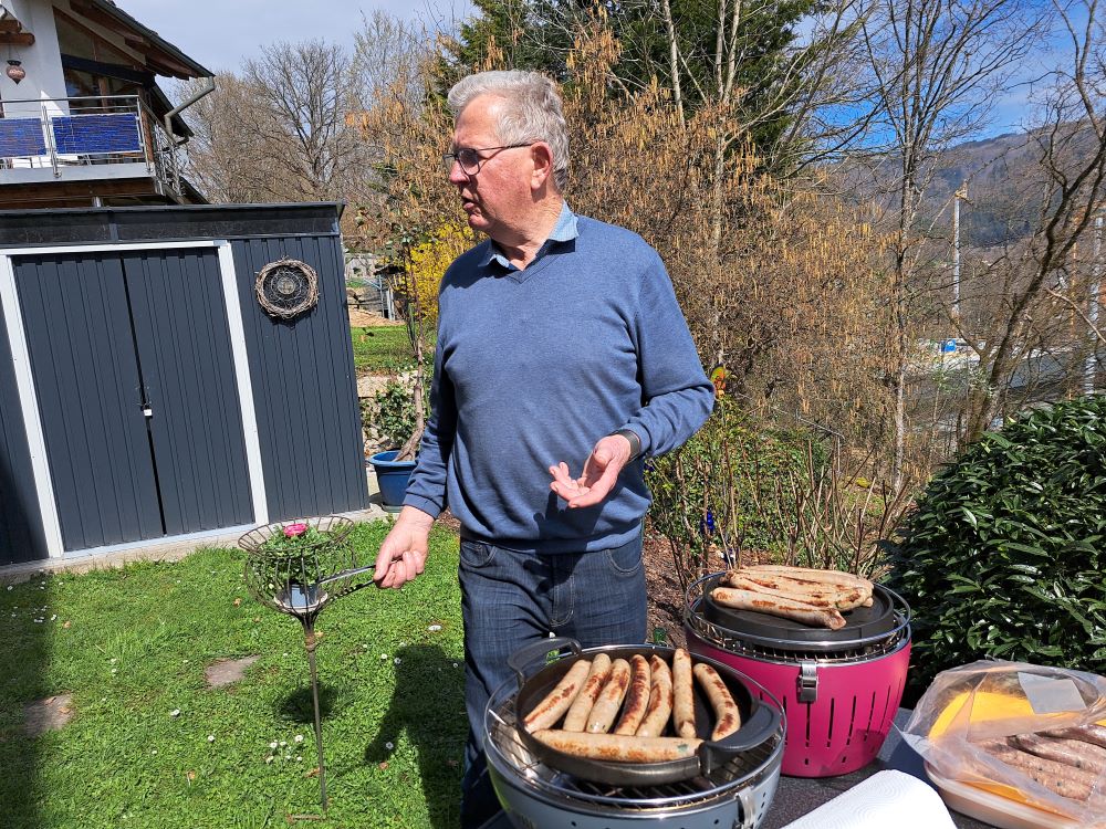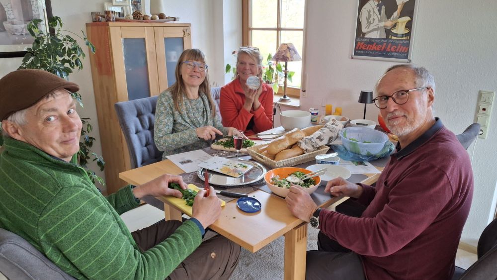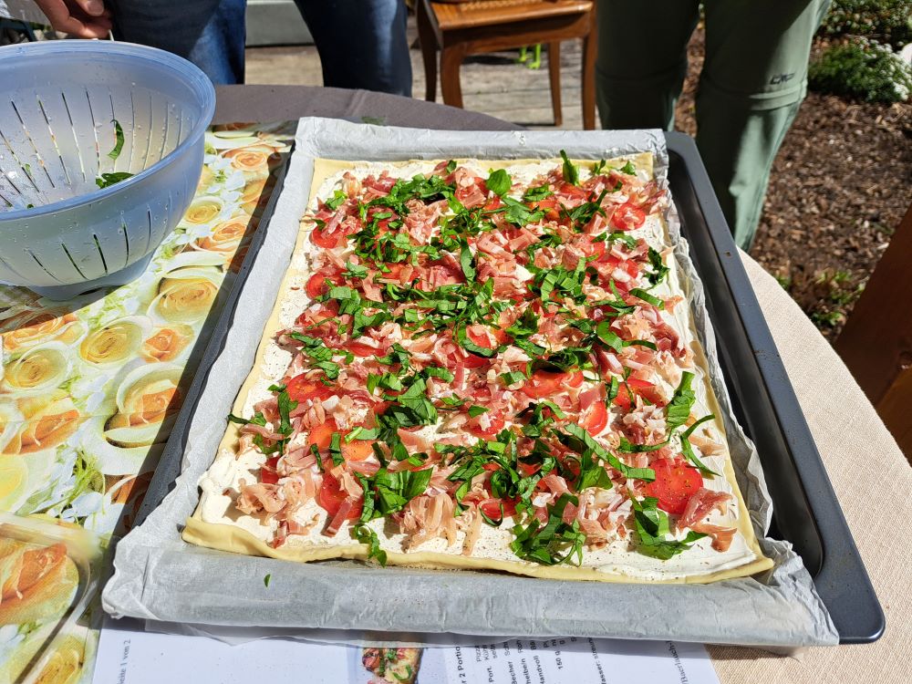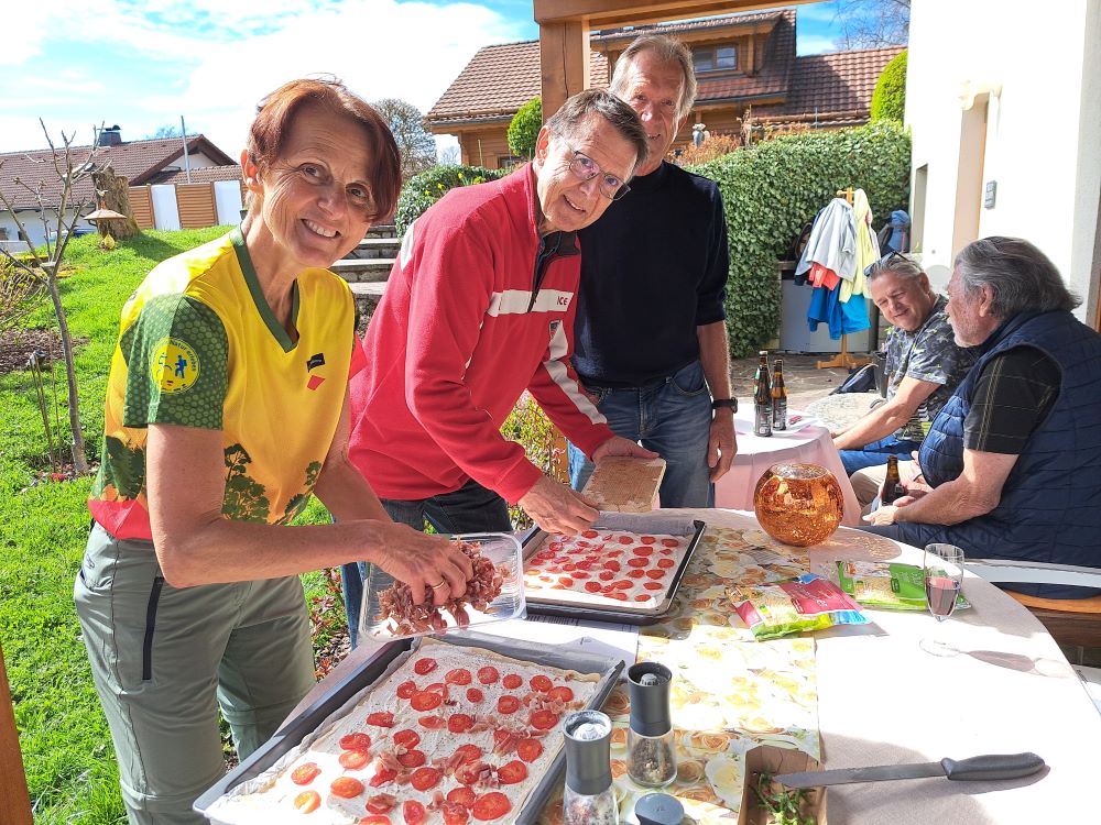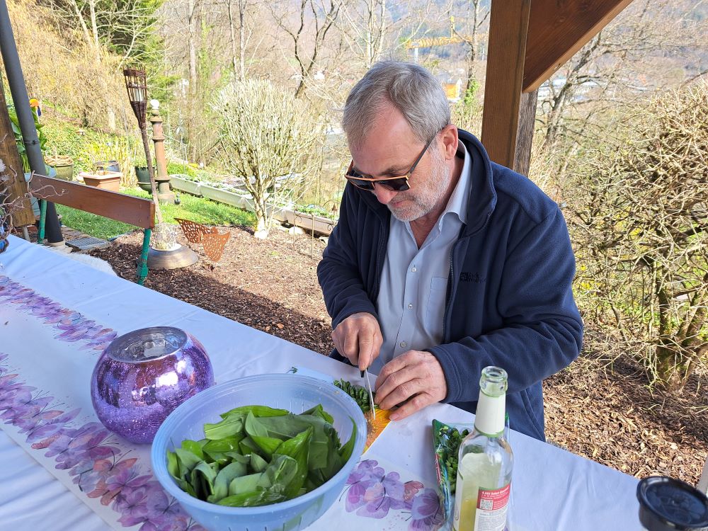 Nun ging es nahtlos über zum kulinarischen Teil des Programms. Chantal hatte schon einiges vorbereitet, stellte uns dann aber auch ihre Küche bzw. gesamte Wohnung zur Verfügung, um Bärlauchspaghetti, Bärlauchpizza und leckeren Brotaufstrich herzustellen. Außerdem grillte ihr sehr sympathischer Vermieter Bärlauchwürste. Dank des schönen Wetters konnten all diese Köstlichkeiten auf der Terrasse mit herrlicher Aussicht verzehrt werden. Durst musste auch niemand leiden. Bier, Sekt und andere Erfrischungsgetränke standen gut gekühlt bereit und fanden ebenfalls reißenden Absatz.