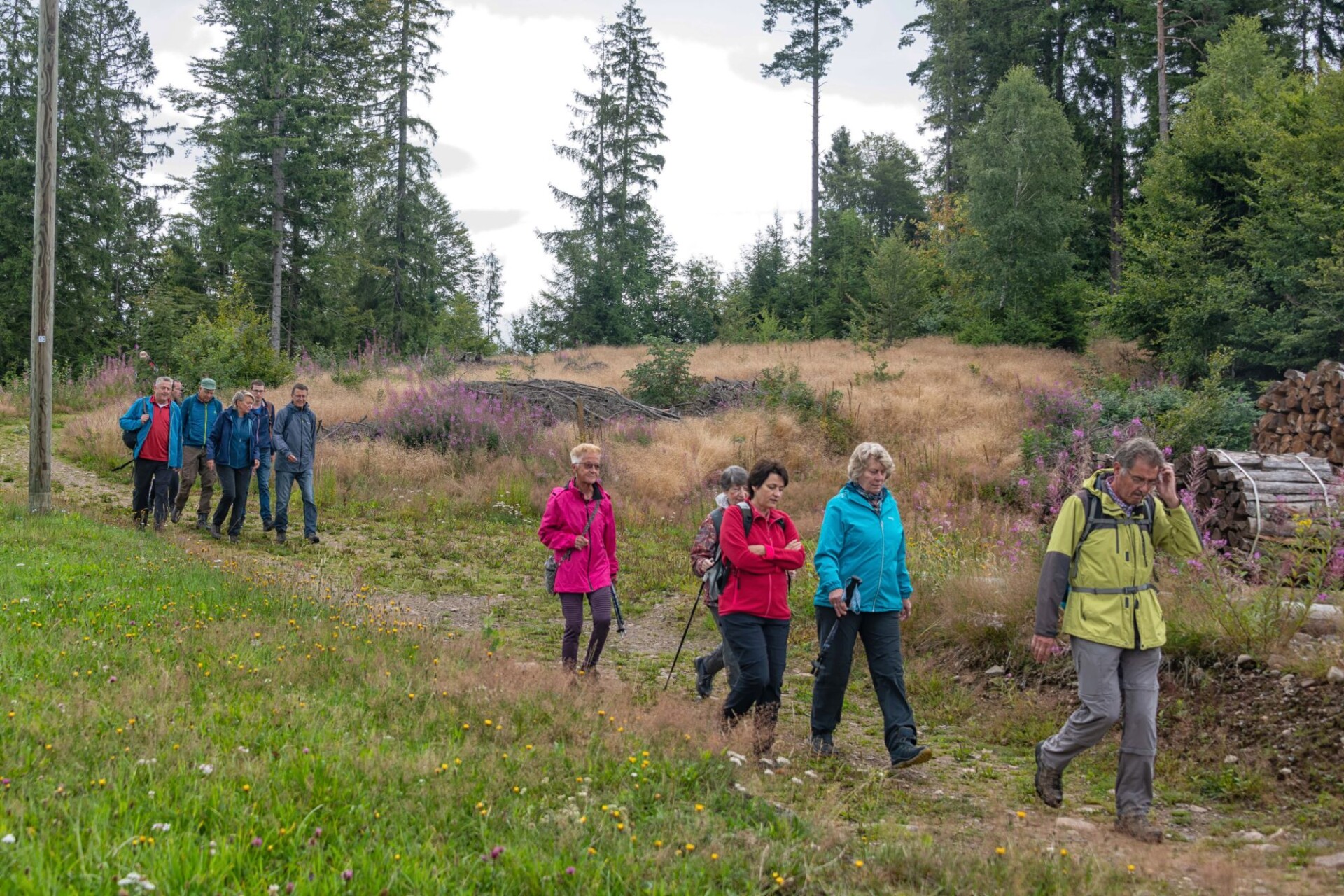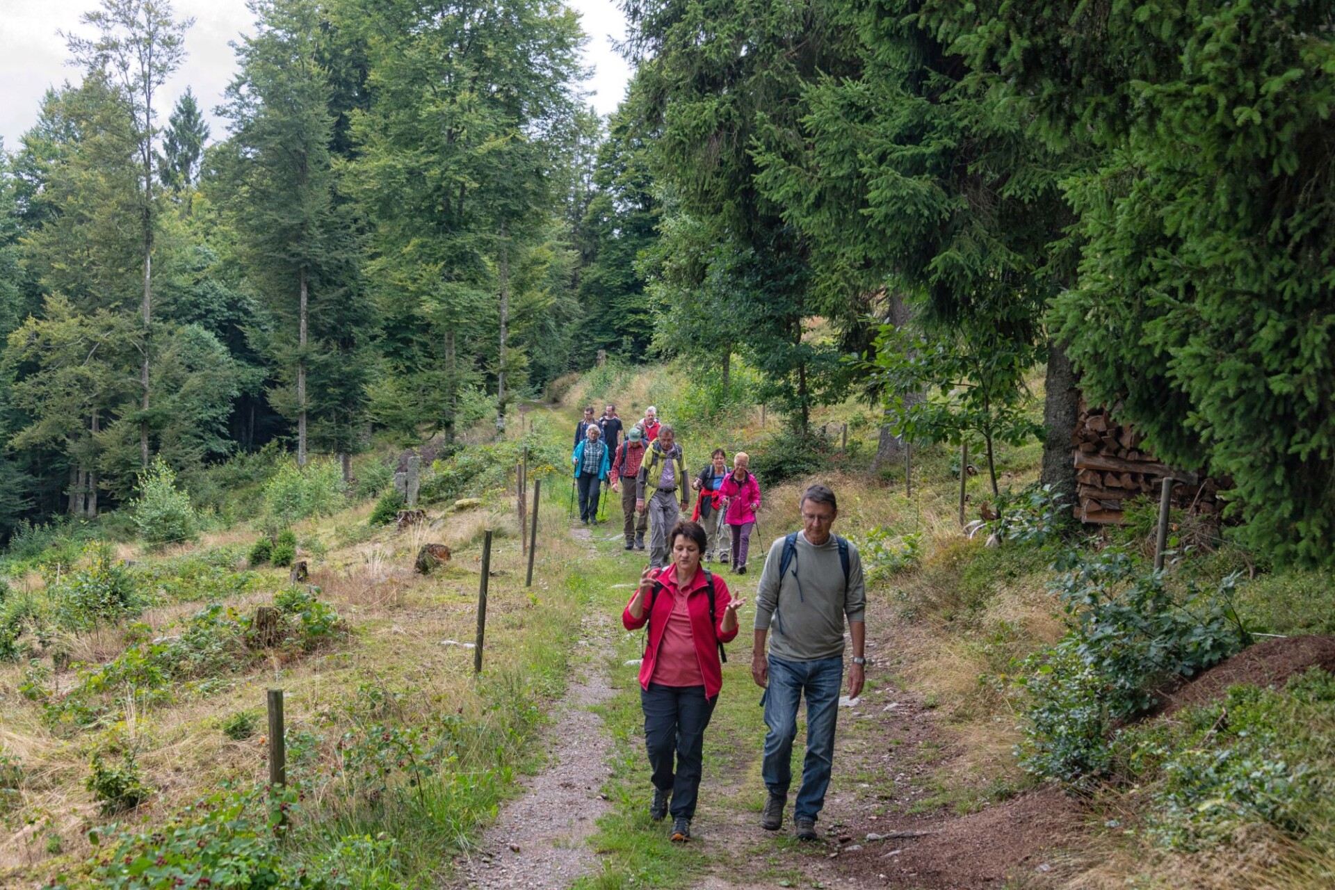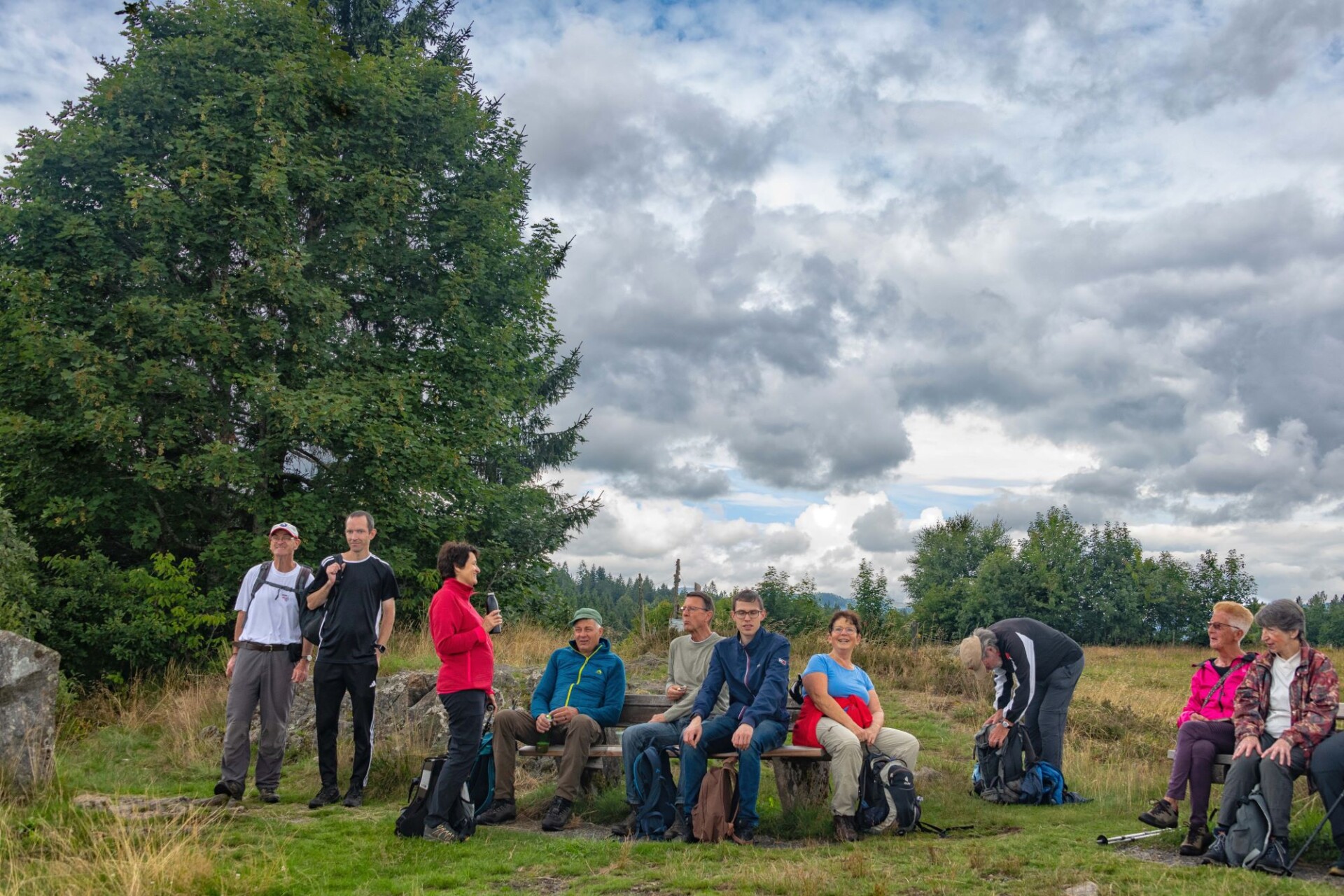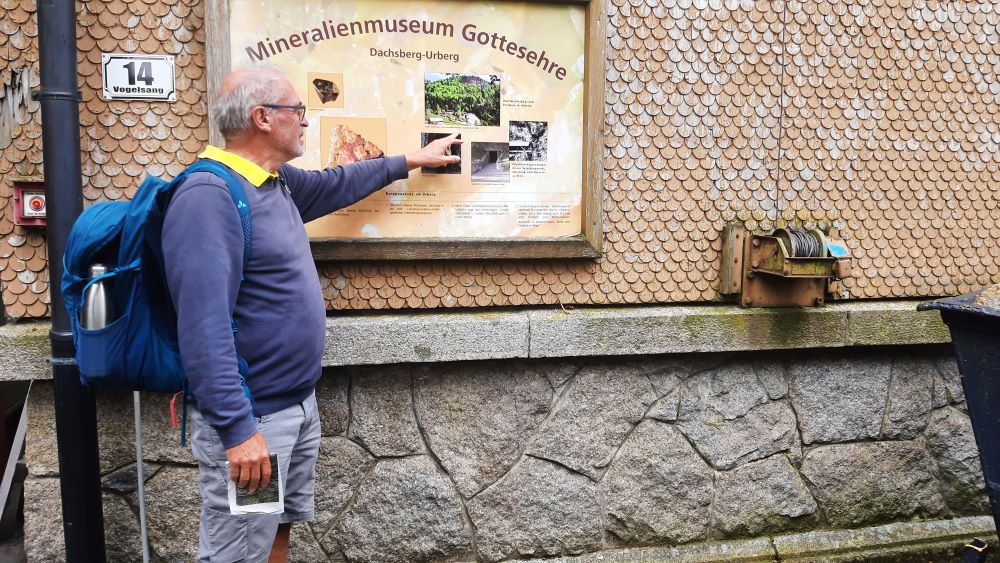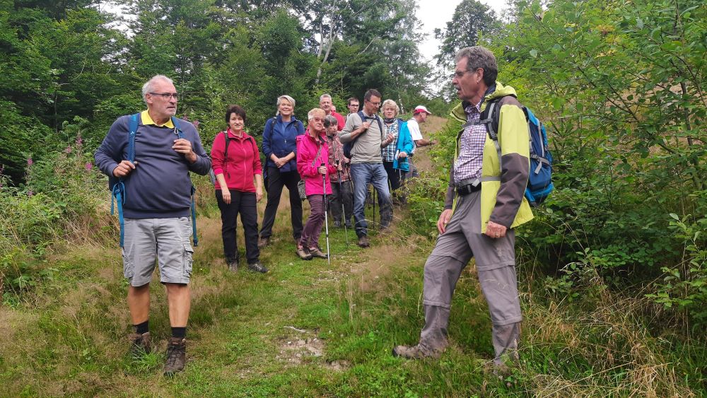Für Sonntag, den 3.8.2025 hatte der Wetterbericht, nach einer verregneten Woche einen regenarmen Tag vorausgesagt. Voller Optimismus auf schöneres Wetter trafen sich 15 Wanderfreunde in Dachsberg-Urberg am Mineralienmuseum „Gottesehre“. Zunächst geht es im Ort leicht bergauf um das Dorf herum. Beim Parkplatz „Rüttewies“ queren wir die Kreisstraße und orientieren uns im Pavillon über die Mineralien und die Geschichte des Ruprechtsgang. Hier beginnt der als Premium- Wanderweg ausgezeichnete Bergwerkspfad. An Informationstafeln geht es auf schmalem Pfad bis zur Straße hinab dort biegen wir direkt wieder in den ausgeschilderten Anstieg ein. Man kann gut erkennen wie die Landschaft für den Abbau durch Pingen, Verhaue und Schutthalden verändert wurde.
