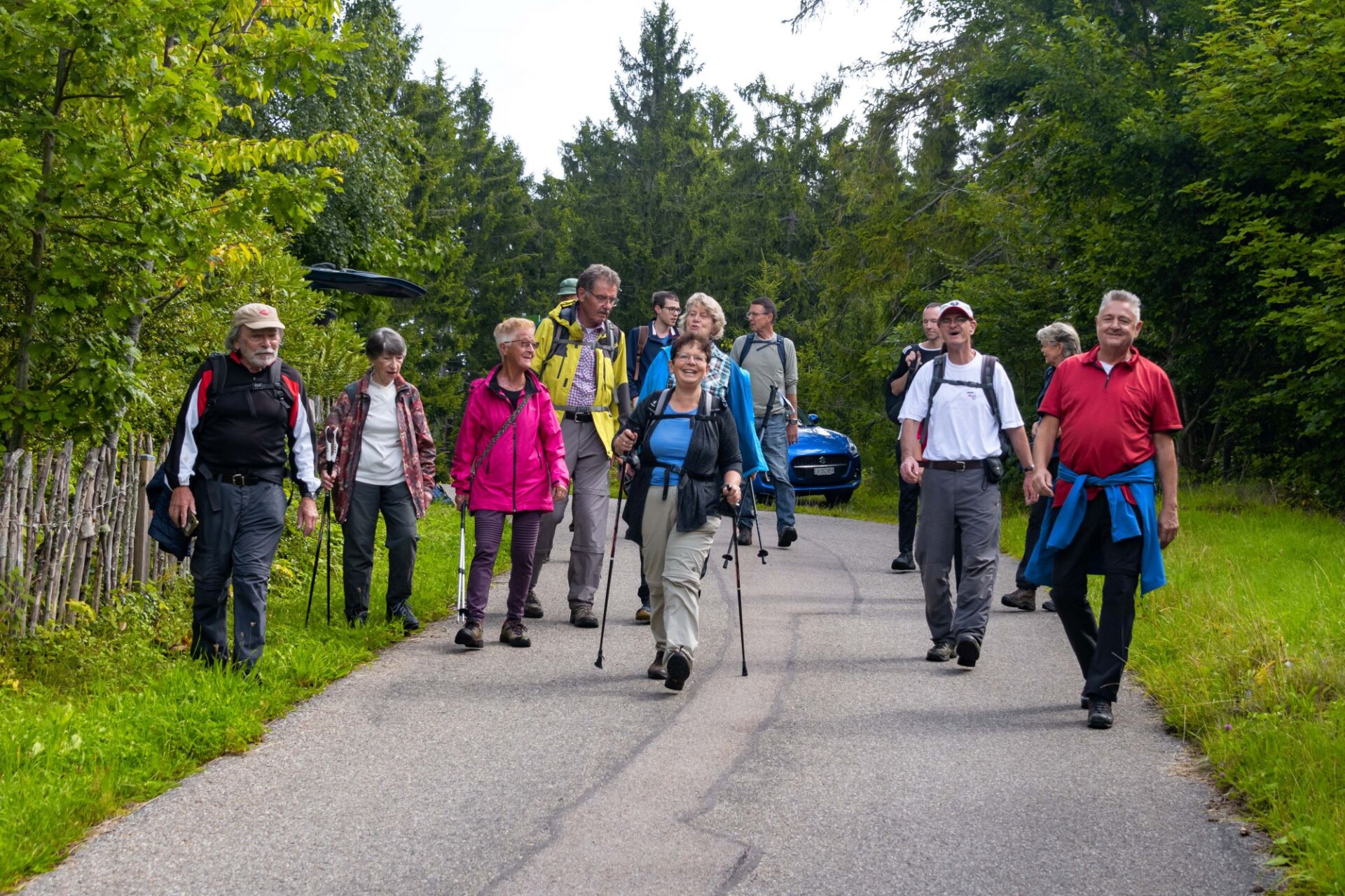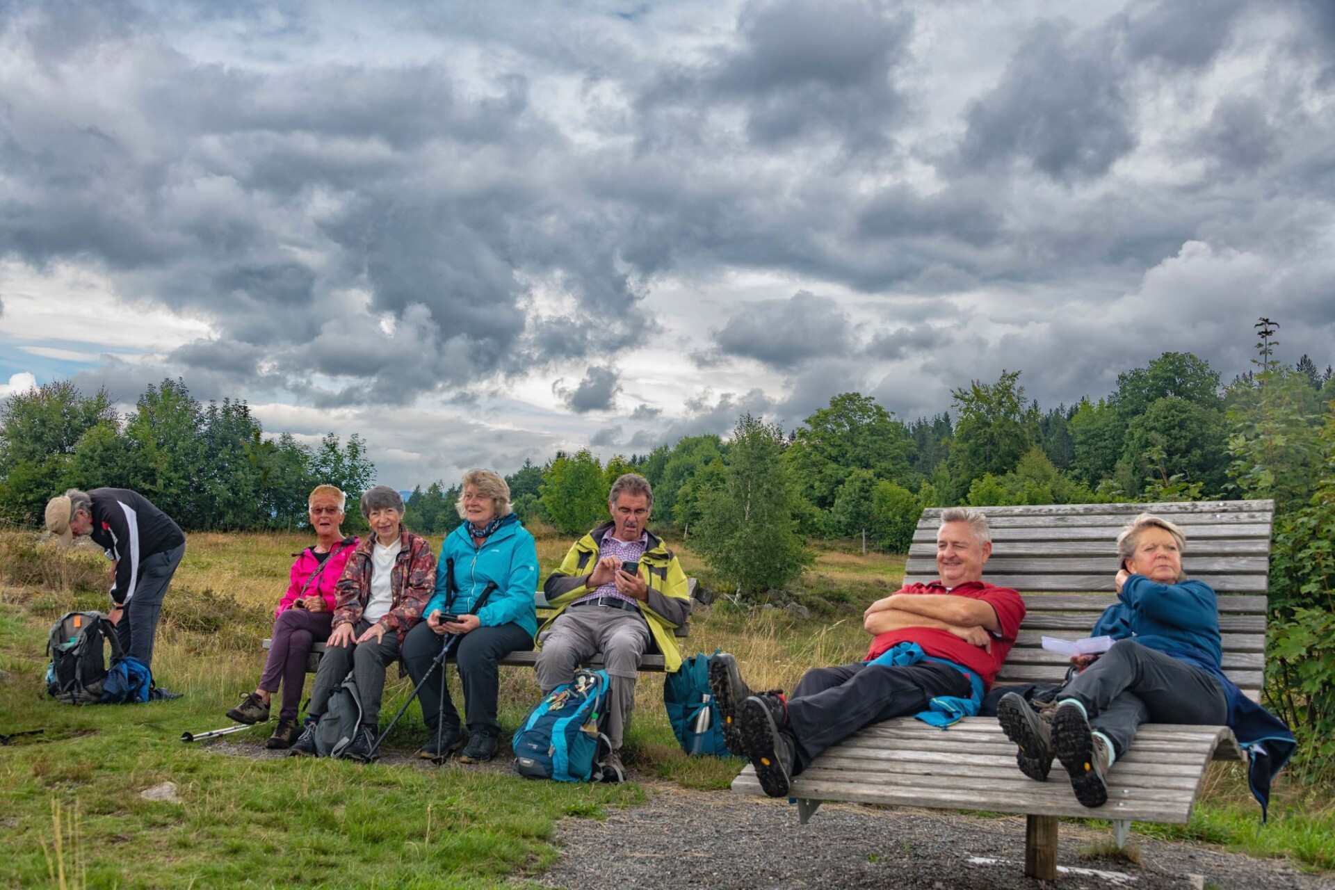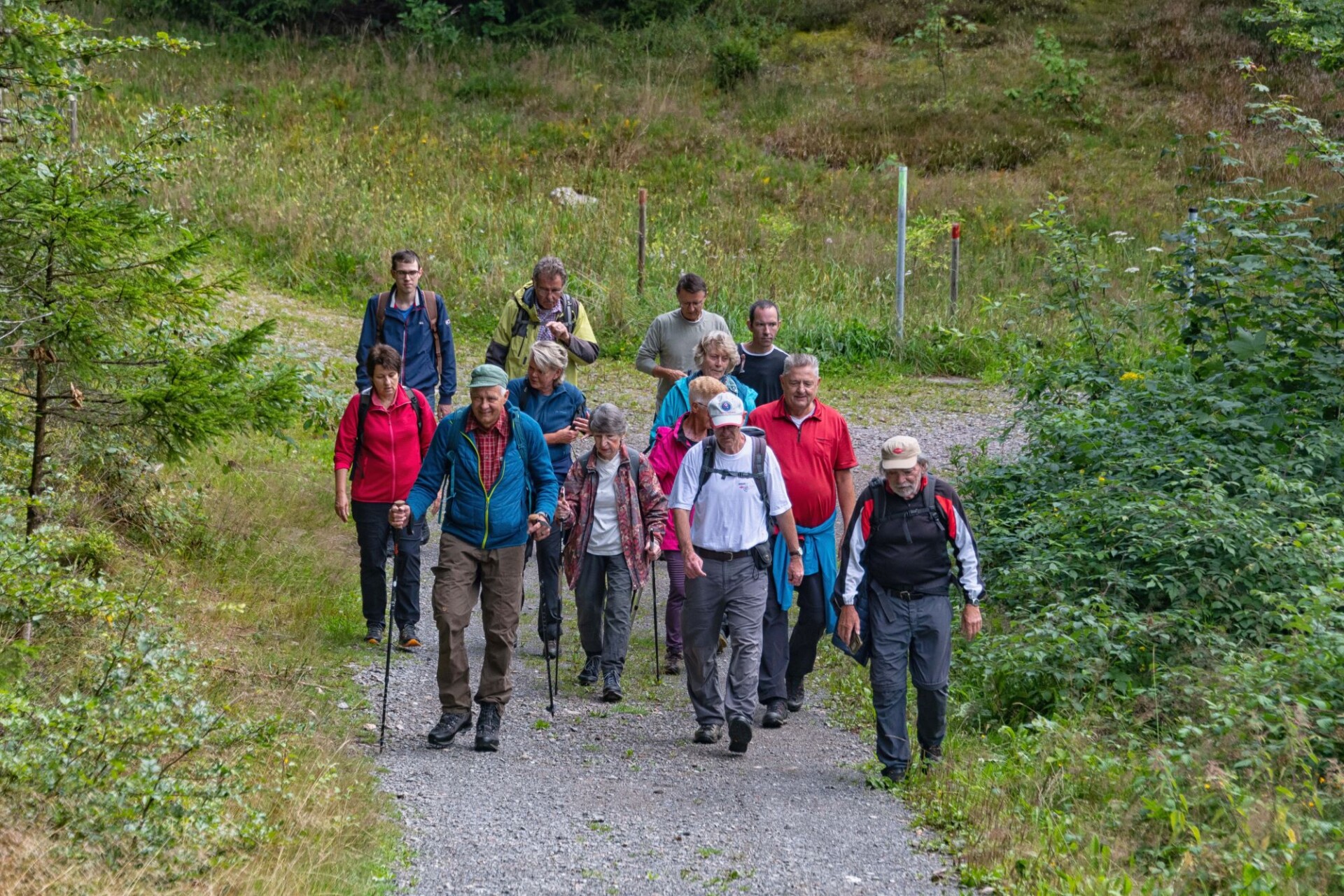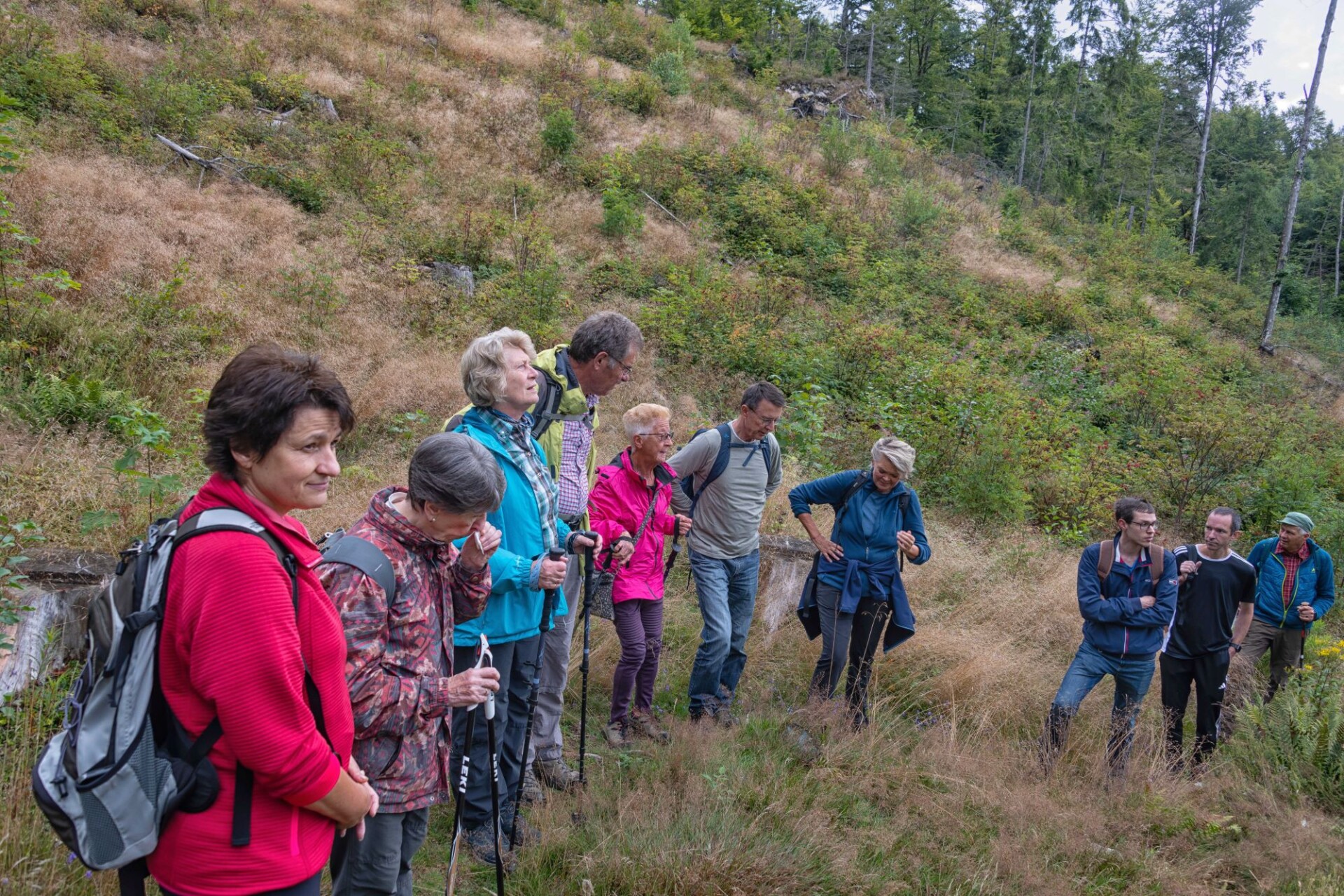 Für Sonntag, den 3.8.2025 hatte der Wetterbericht, nach einer verregneten Woche einen regenarmen Tag vorausgesagt. Voller Optimismus auf schöneres Wetter trafen sich 15 Wanderfreunde in Dachsberg-Urberg am Mineralienmuseum „Gottesehre“. Zunächst geht es im Ort leicht bergauf um das Dorf herum. Beim Parkplatz „Rüttewies“ queren wir die Kreisstraße und orientieren uns im Pavillon über die Mineralien und die Geschichte des Ruprechtsgang. Hier beginnt der als Premium- Wanderweg ausgezeichnete Bergwerkspfad. An Informationstafeln geht es auf schmalem Pfad bis zur Straße hinab dort biegen wir direkt wieder in den ausgeschilderten Anstieg ein. Man kann gut erkennen wie die Landschaft für den Abbau durch Pingen, Verhaue und Schutthalden verändert wurde.