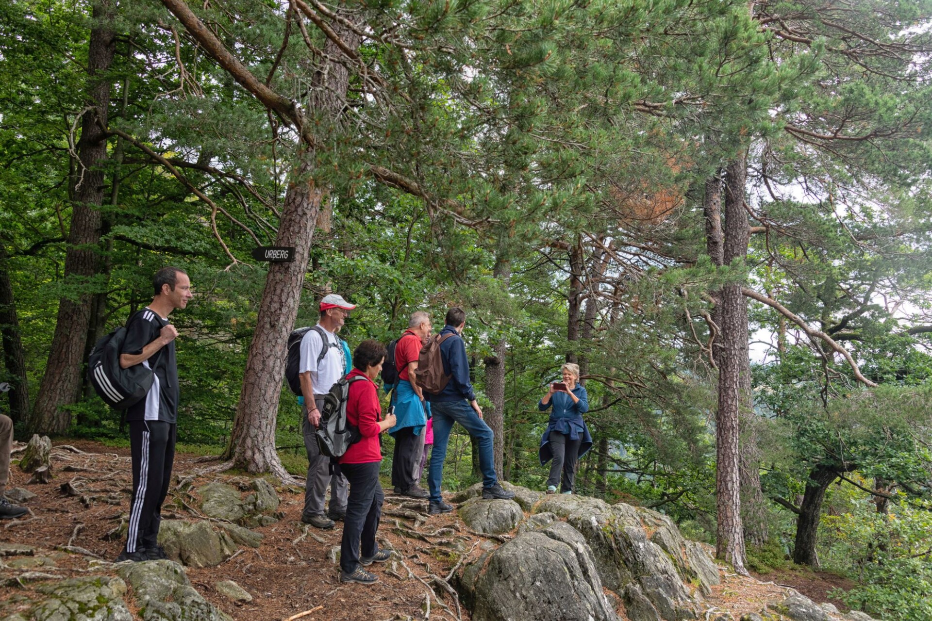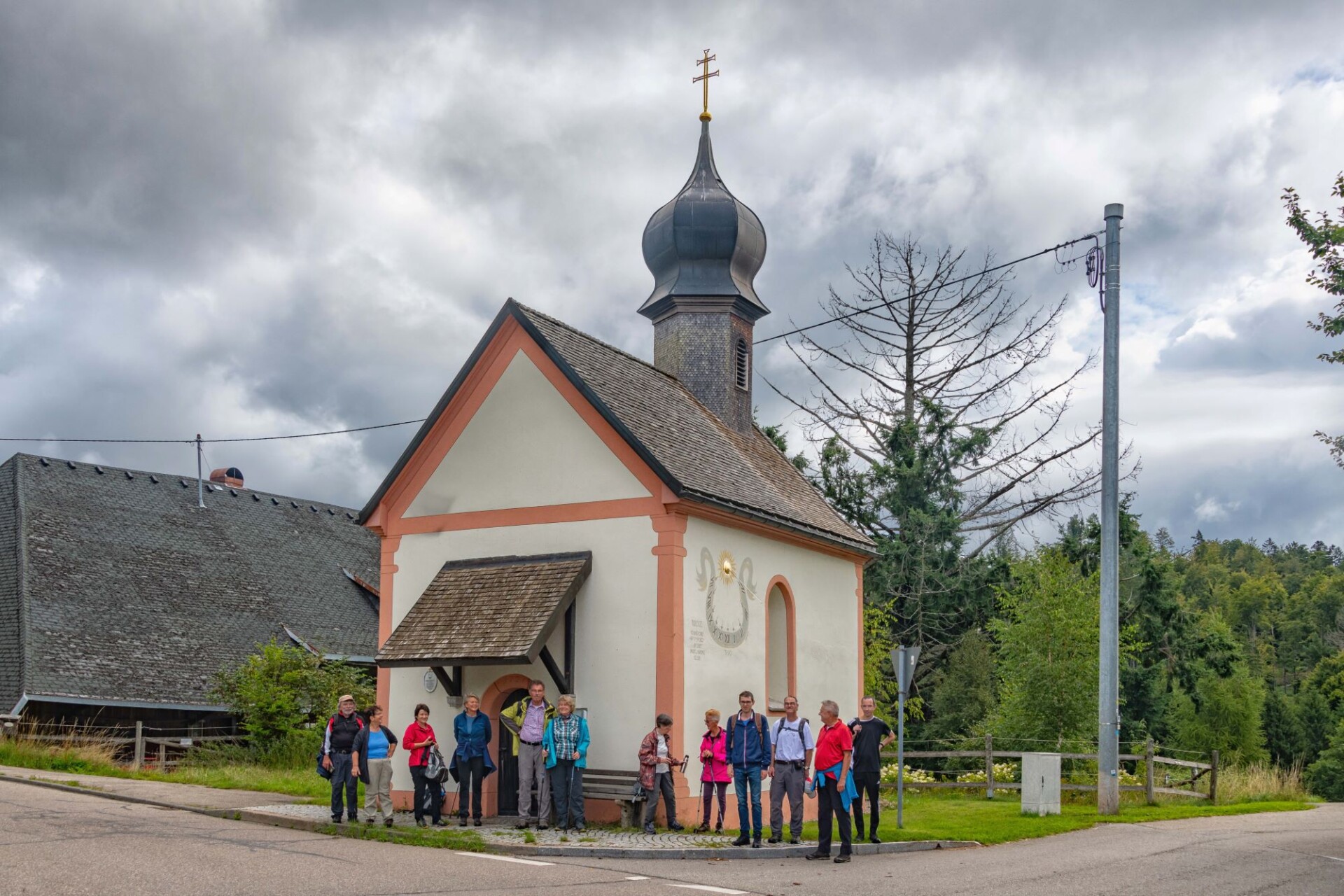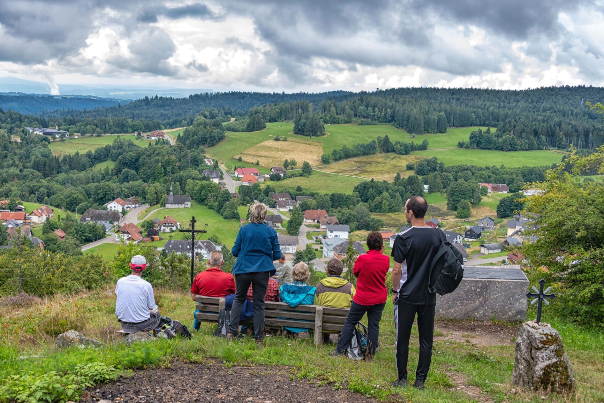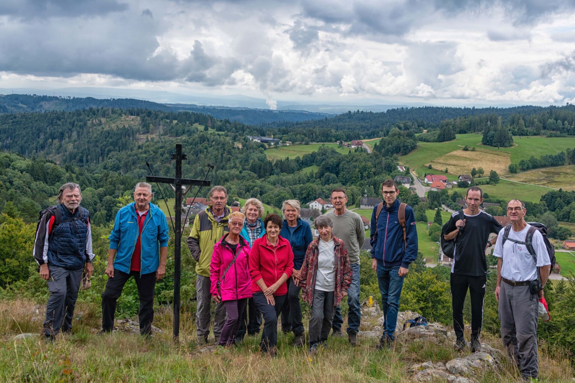 Wir schlagen noch einen Bogen um den Katzenkopf herum. Vorbei am Goldenhof, der eine 1990 gegründete Waldorfschule beherbergt geht es bis zum Bildsteinfelsen. Der spektakuläre Aussichtspunkt befindet sich oberhalb des aufgelassenen Grubeneingangs “Gottesehre“. Wir folgen dem ausgeschilderten Weg nach Urberg und haben zum Abschluss noch einen Blick über das Albtal zum Rothausturm von Höchenschwand. Nach einem Anstieg ist dann die Kirche von Urberg in Sicht und wir kommen wieder zum Ausgangspunkt trocken zurück. Denn unser Optimismus hat sich gelohnt; trotz ab und zu aufziehender Wolken fiel kein Regen.