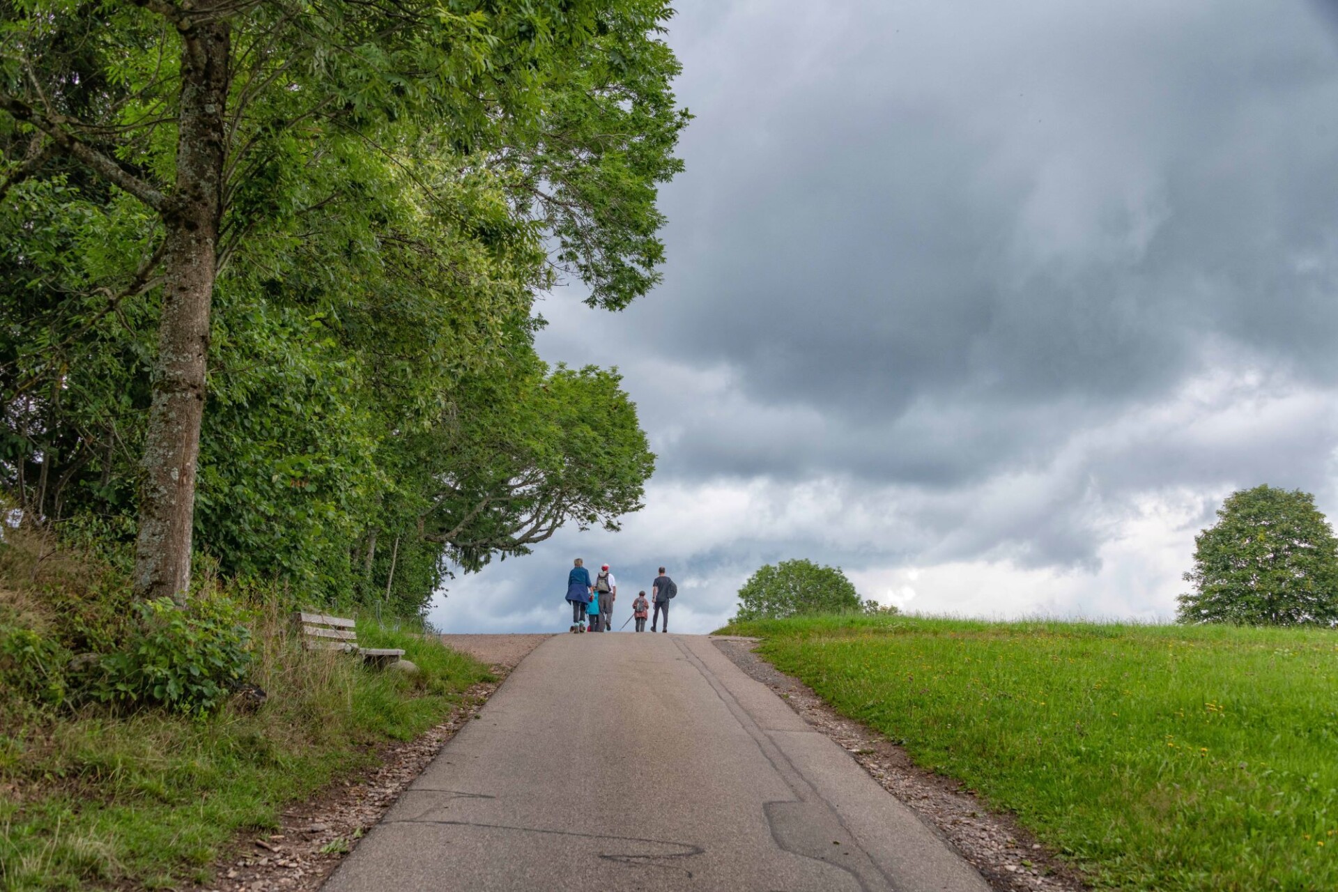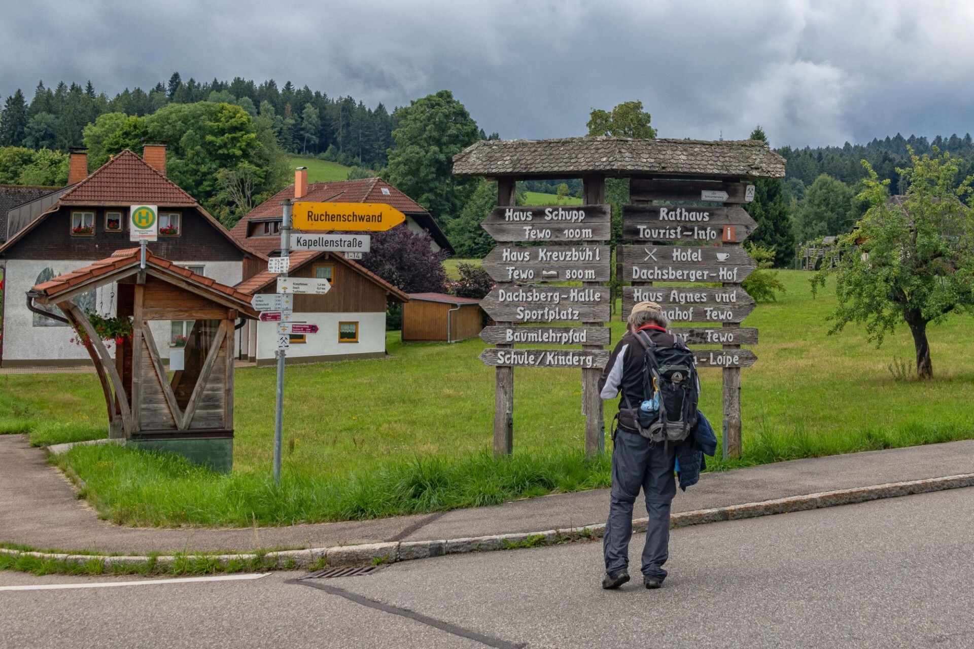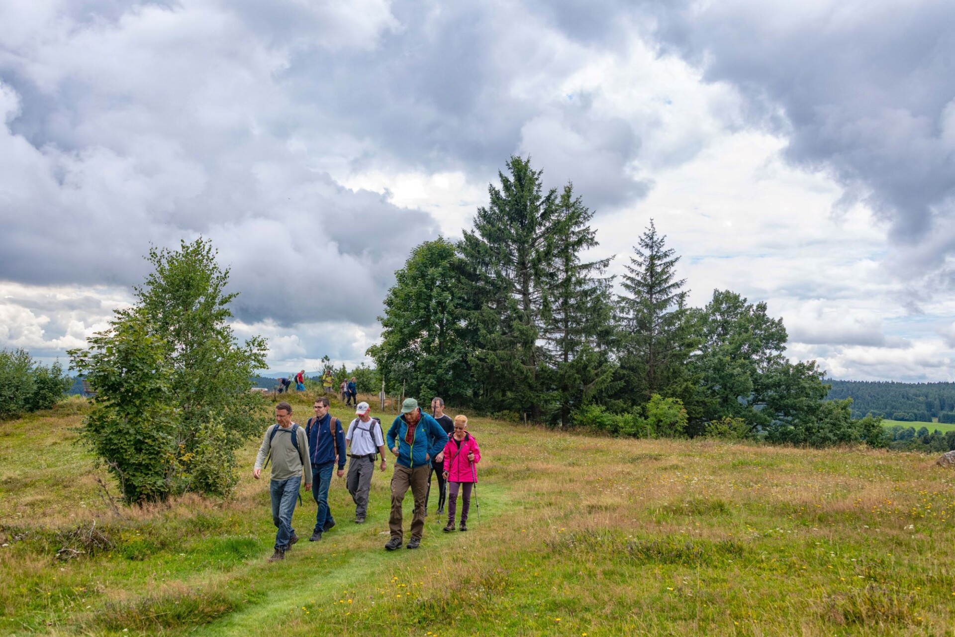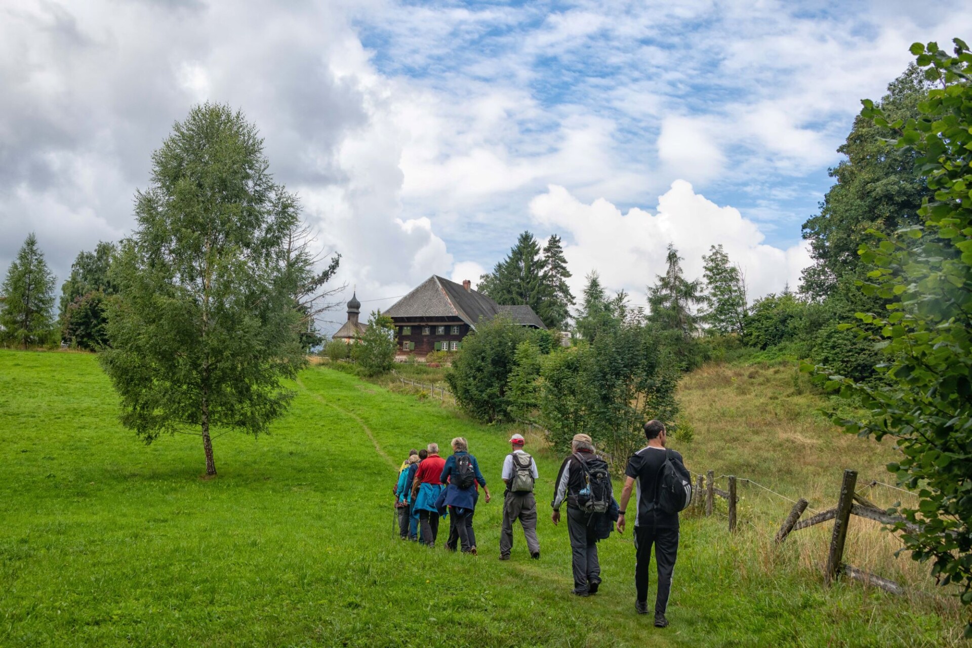 Wir schlagen noch einen Bogen um den Katzenkopf herum. Vorbei am Goldenhof, der eine 1990 gegründete Waldorfschule beherbergt geht es bis zum Bildsteinfelsen. Der spektakuläre Aussichtspunkt befindet sich oberhalb des aufgelassenen Grubeneingangs “Gottesehre“. Wir folgen dem ausgeschilderten Weg nach Urberg und haben zum Abschluss noch einen Blick über das Albtal zum Rothausturm von Höchenschwand. Nach einem Anstieg ist dann die Kirche von Urberg in Sicht und wir kommen wieder zum Ausgangspunkt trocken zurück. Denn unser Optimismus hat sich gelohnt; trotz ab und zu aufziehender Wolken fiel kein Regen.