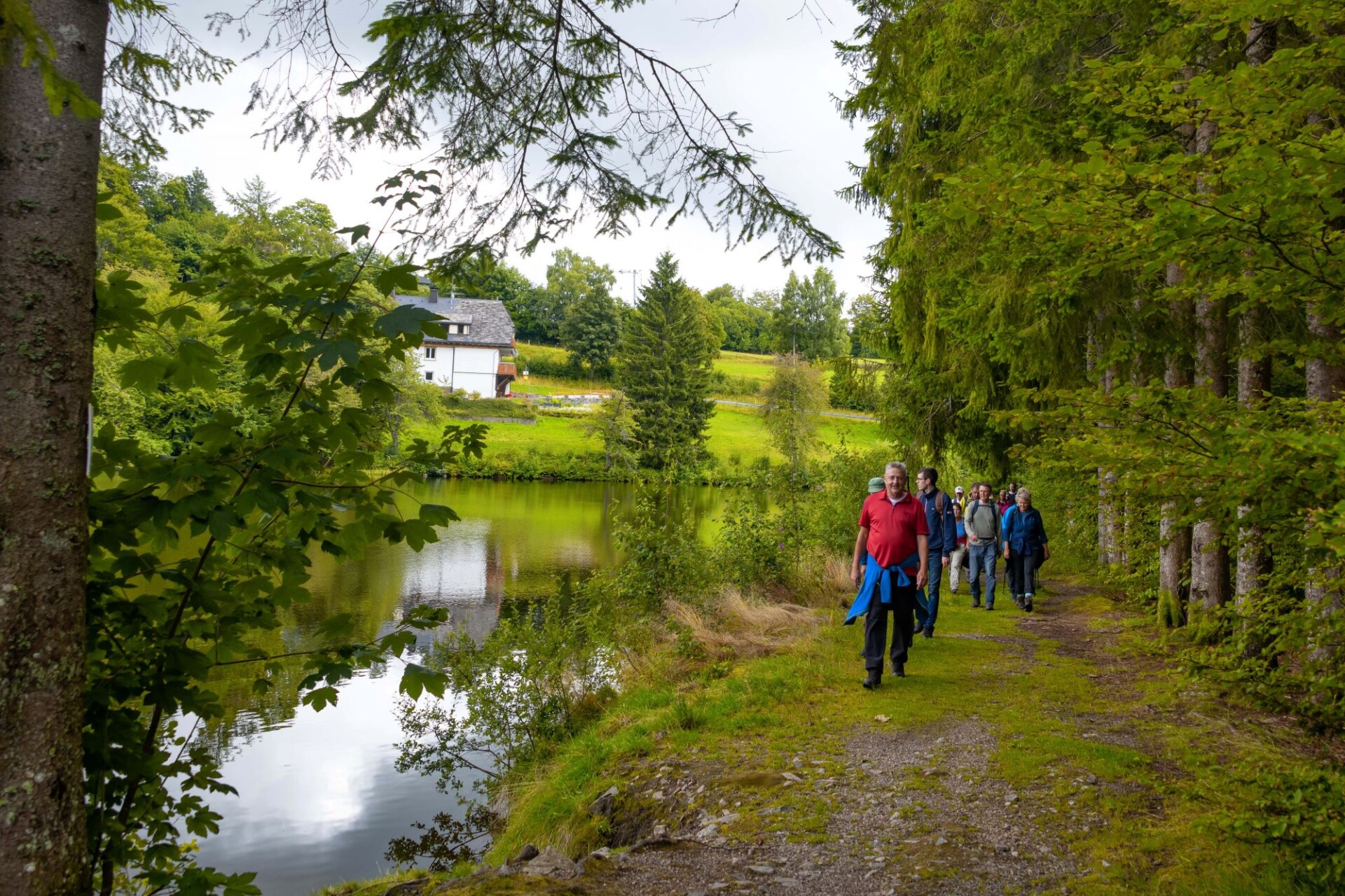 Nun geht es zum Klosterweiher herunter. Am See entlang geht es weiter über die Horbacher Hütte zum Ort Horbach. Über eine Treppe gelangen wir zum Aussichtspunkt „Zum Bürgle“. Dort konnten wir die schöne Landschaft genießen und nach einer kurzen Pause überqueren wir die Wiese und laufen einen Pfad leicht bergab und kommen dann an eine Tafel mit der Aufschrift „Grube Gottesehre“. Von dort steigen wir auf schmalen Weg zur Straße herab.