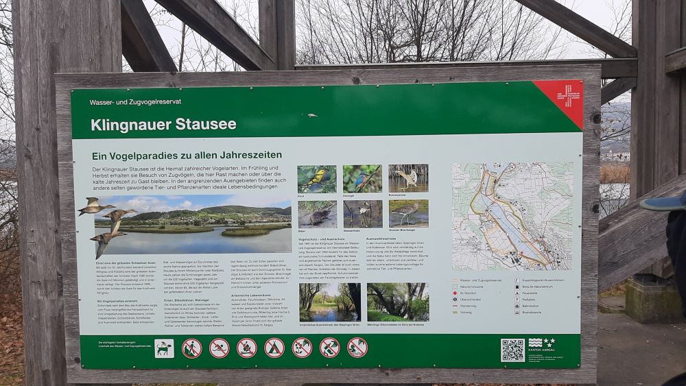 Der Klingnauer Stausee liegt im Kanton Aargau auf 318m ü.M., ist ca. 3 km lang, bis zu 500m breit und an der tiefsten Stelle 8,5m tief.