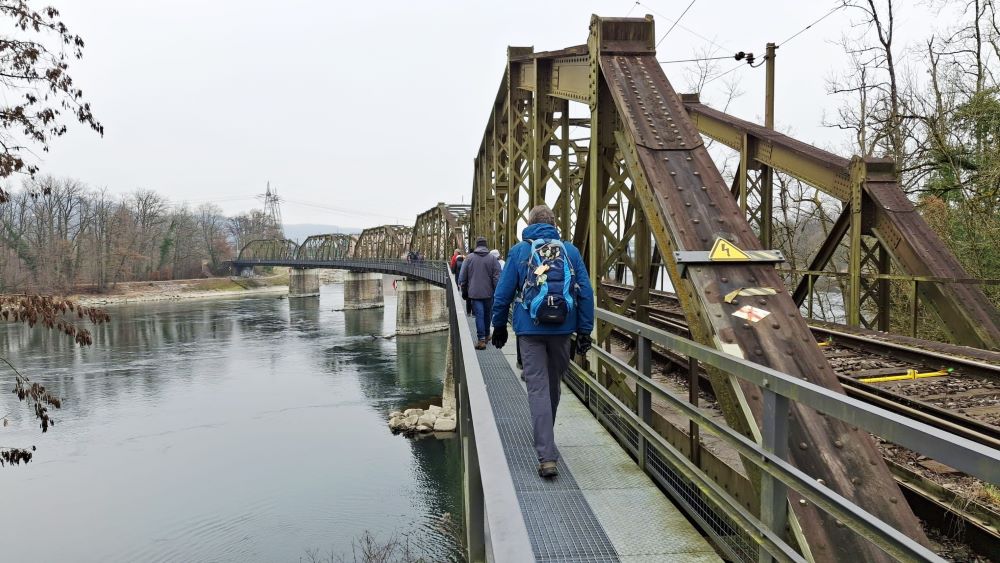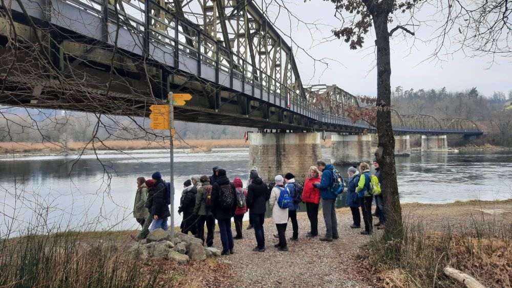 Am Aare-Westufer ging es nun wieder zurück in Richtung Kraftwerk. Bevor wir dieses erreichten, überquerten wir den Fluss aber noch einmal auf einer historischen Eisenbahnbrücke. Von dort aus hatte man auch einen sehr guten Blick ins Gippinger Grien. Grien ist ein schweizerischer bzw. alemannischer Ausdruck für Kies, Kiesbank oder Schwemmland. Das Gippinger wie auch das Koblenzer Grien sind durch die Begradigung der Aare kurz vor 1900 entstanden. Sie sind Lebensraum für viele Tierarten, als Naturschutzgebiete ausgewiesen und dürfen nicht betreten werden.