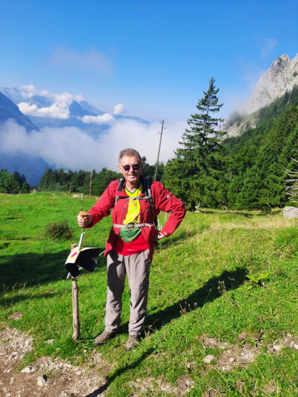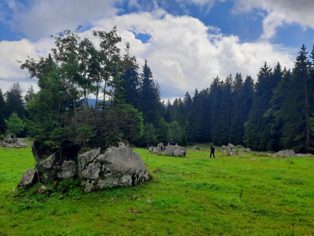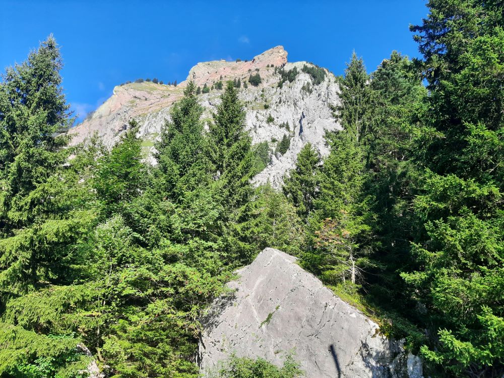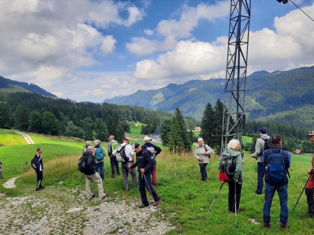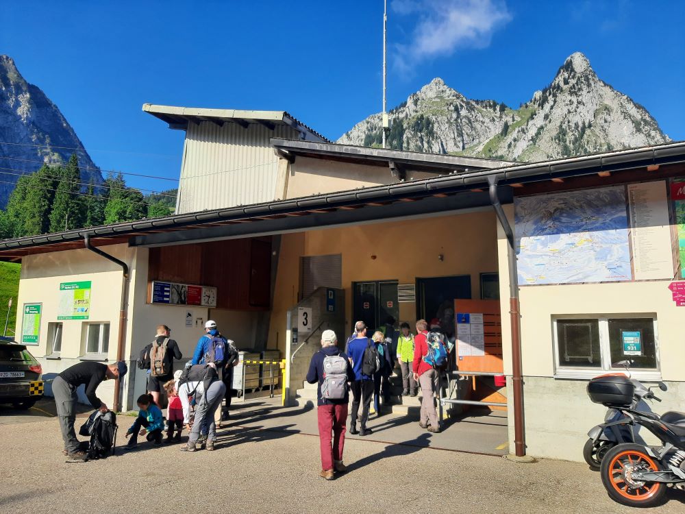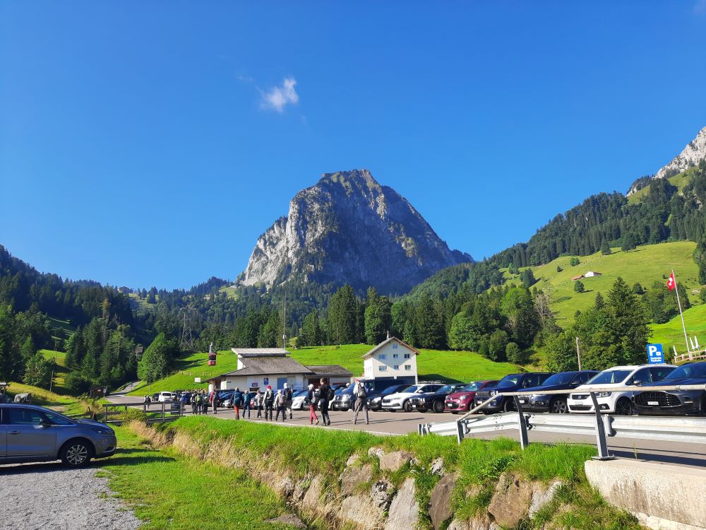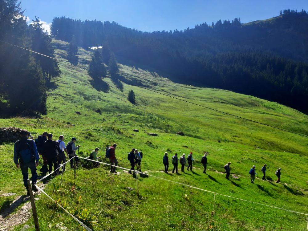 Die Felspyramiden leuchteten im Morgenlicht als die 19 Bergwanderbegeisterten das Ziel der diesjährigen Alpenwanderung erreichten. Mit der Gondelbahn schwebten wir zur Bergstation Holzegg. Über Viehweiden, teilweise über Treppenstufen führte der Weg zunächst abwärts, immer wieder boten sich schöne Ausblicke auf den Vierwaldstättersee, die Mythen und die umgebende Bergwelt.