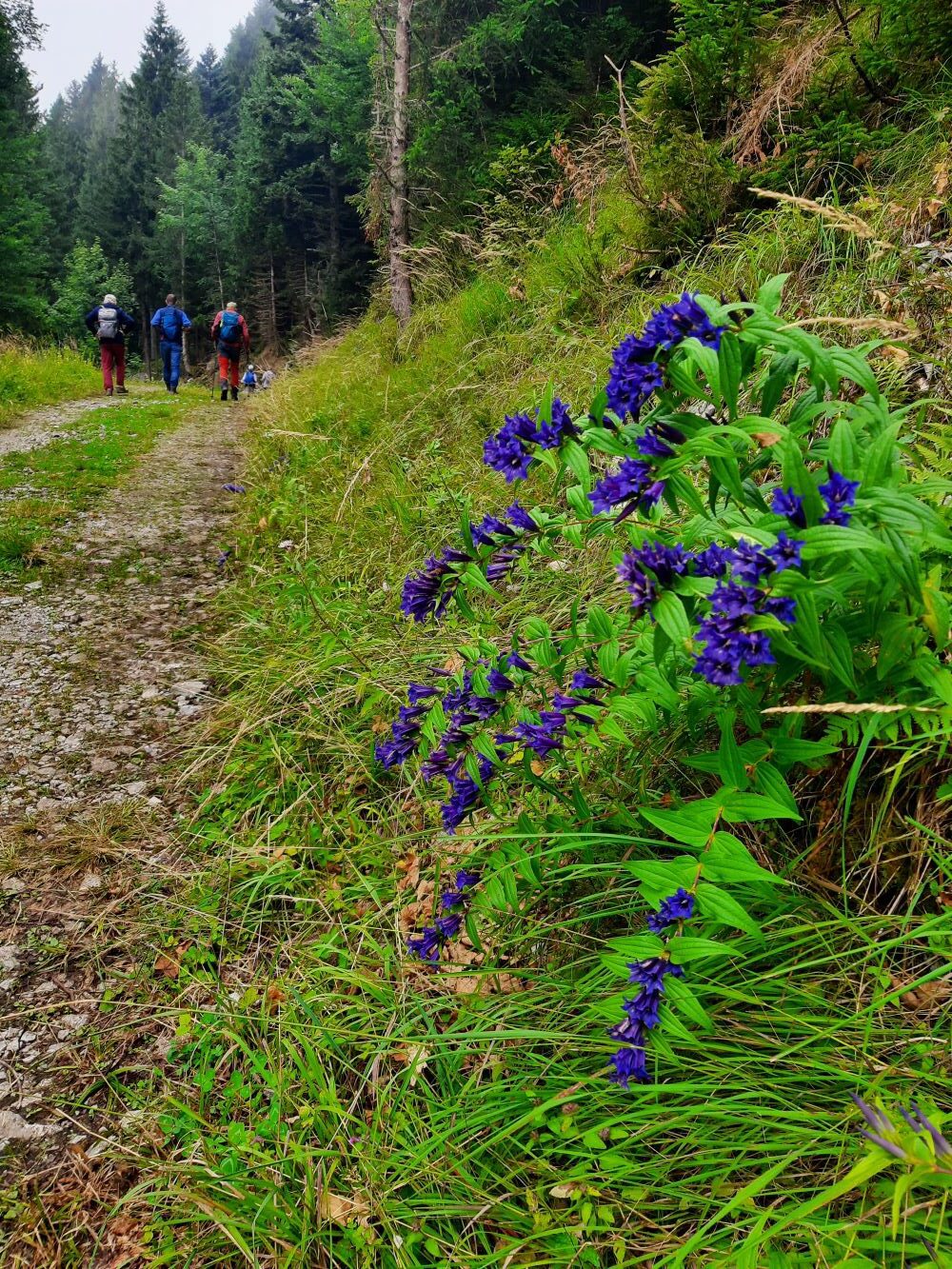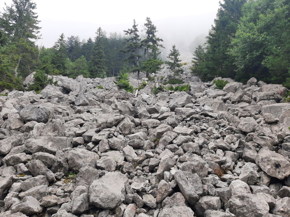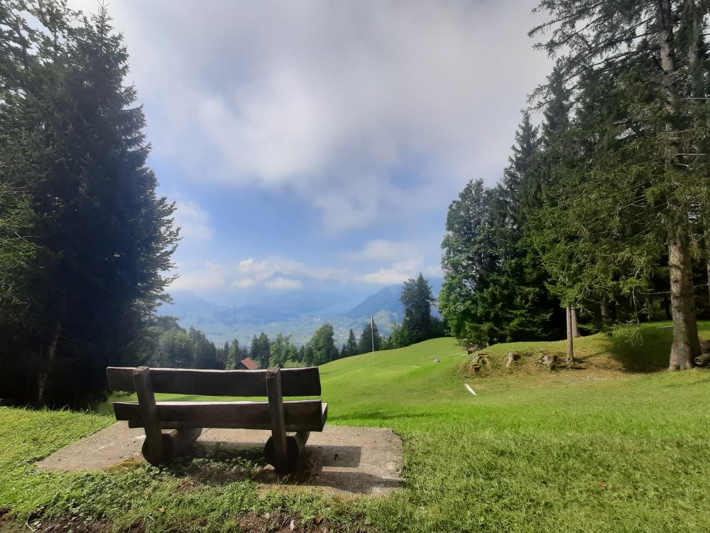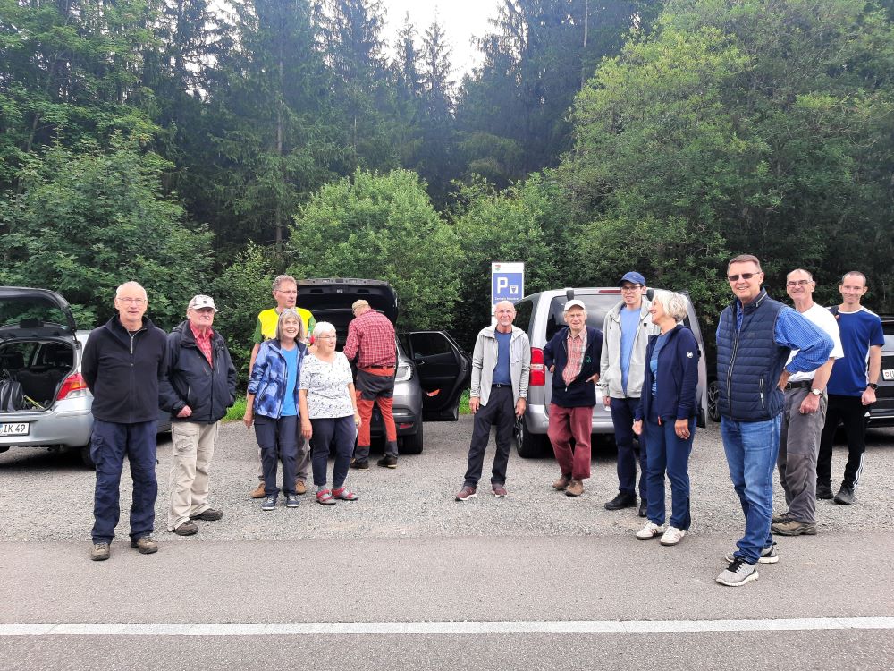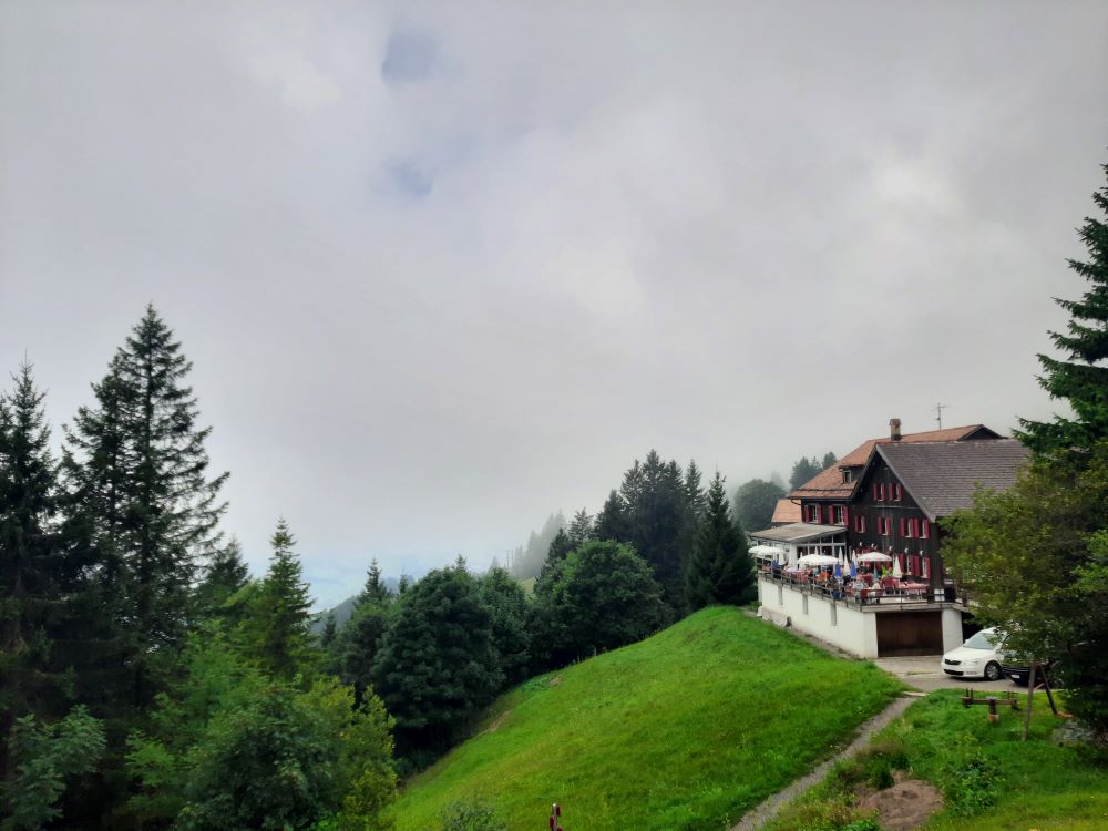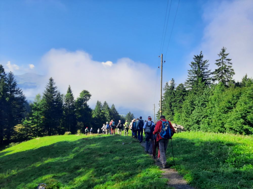 Von Hölzli an ging es aufwärts teils auf schmalen Pfaden, teils auf breiten Forstwegen, vorbei an Geröllhalden, durch Bannwald. Vom See zogen Nebelschwaden auf, die die Fernsicht beeinträchtigten aber dafür sorgten, dass der sehr steile Schlussaufstieg zum Haggenegg nicht zu schweißtreibend wurde. Im Berggasthof gab es erfrischenden „Suuren Moscht“und Kaffee. Nach der Stärkung mit der Verpflegung aus dem Rucksack erfolgte der Abstieg vorbei an der Pilgerkapelle am Jakobsweg, über grüne Matten nach Brunni. Wieder im Sonnenschein traten wir die Heimreise an.