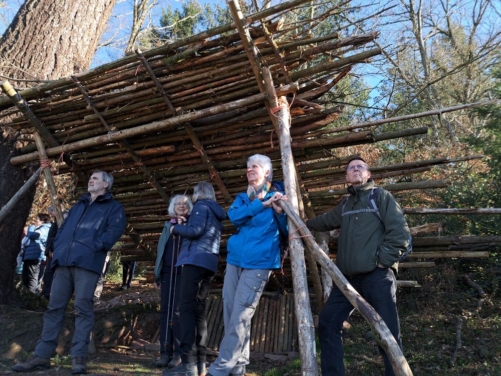 Ein weiterer Abstecher brachte uns zum Waldsofa. Wer auch immer das erbaut hat, hat sich richtig Mühe gegeben. Um dies zu würdigen, haben wir dort ein Gruppenfoto aufgenommen. Vorbei am Thimospilz und unter den Linden der Lindenallee wanderten wir zurück zum Ausgangspunkt am Bahnhof.