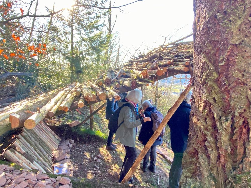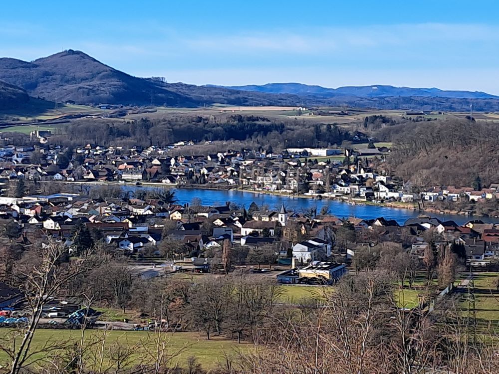 Den Abschnitt vom Bahnhof bis zum Friedhof legten wir zügig zurück. Dann begann der spannende Teil. Auf überwiegend schmalen Pfaden, die nicht als öffentliche Wanderwege ausgewiesen sind sowie stellenweise querfeldein erreichten wir schließlich einen Aussichtspunkt mit Blick auf Wallbach und dank der klaren Sicht weit in die dahinterliegende Landschaft hinein. Ein großes Dankeschön an die unbekannten Hüttenbauer, die diesen Platz so wunderschön hergerichtet haben.