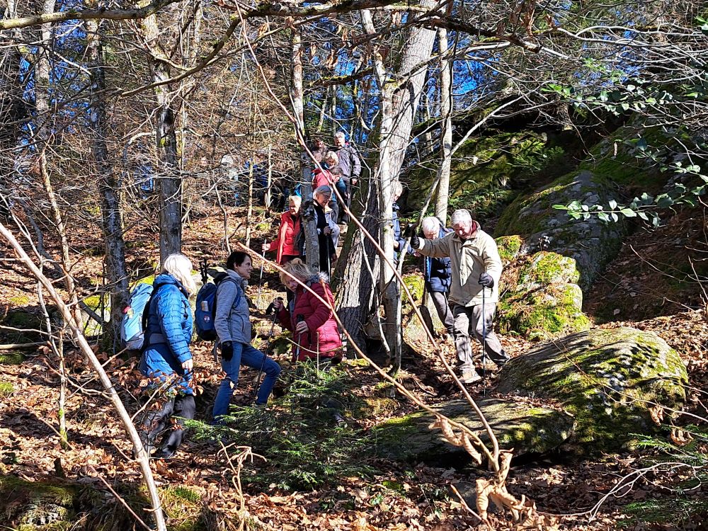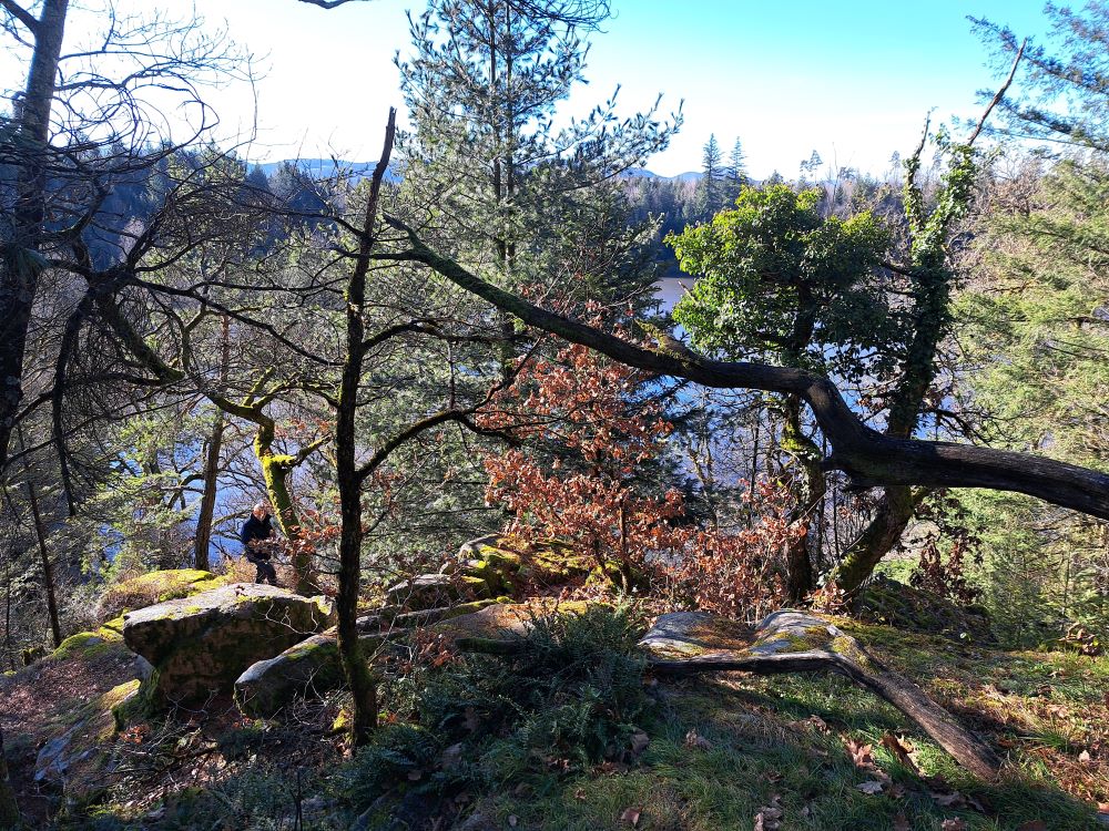Weiter ging’s und kurz vor Erreichen des Bergsees bogen wir auf den Felsenpfad ab. Oben angekommen, ging es ein kurzes Stück auf dem breiten Waldweg entlang, bis wir auf den Pfad auf dem kleinen Grat zwischen Bergsee und Günnenbacher Straße abgebogen sind. Nun war es nicht mehr weit bis zum Scheffelfelsen, wo wir eine sehr angenehme Mittagsrast in der wärmenden Sonne verbracht haben.