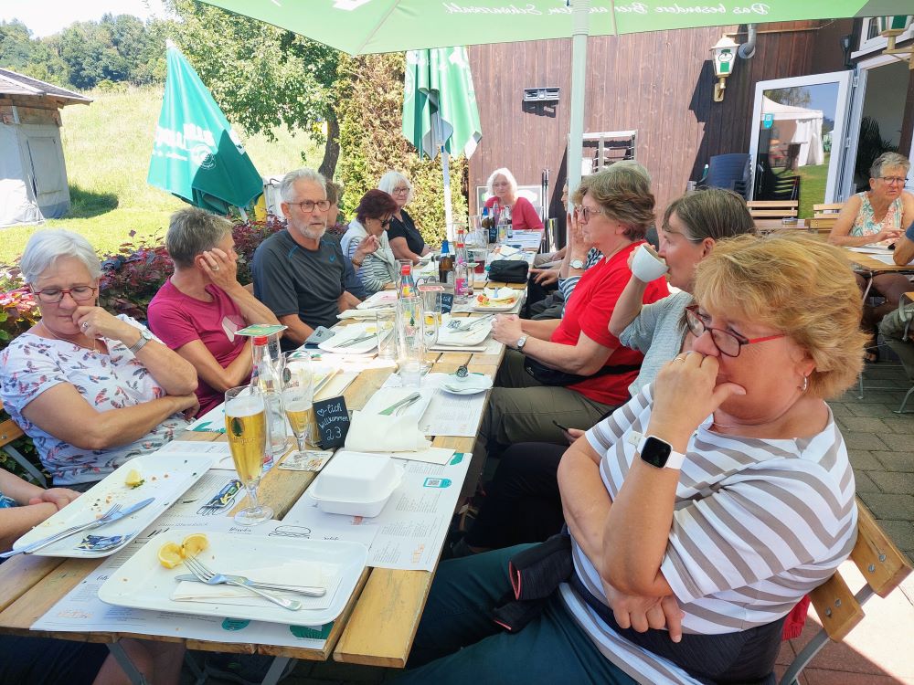 18 Wanderfreunde haben sich bei idealem Wanderwetter auf den Weg zum „Fischerhaus“ gemacht, um zu prüfen, ob die Fischknusperle noch genauso gut schmecken wie letztes Jahr. Das Ergebnis der Prüfung: Ja, das tun sie. Beim Essen haben sich noch drei weitere Wanderfreunde dazu gesellt.