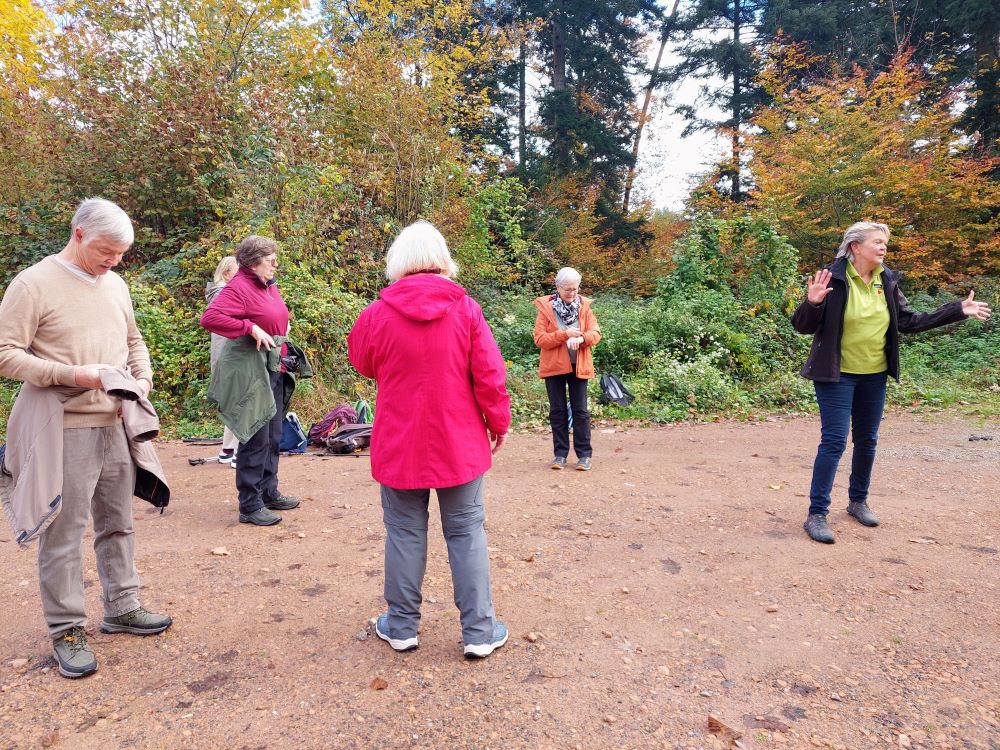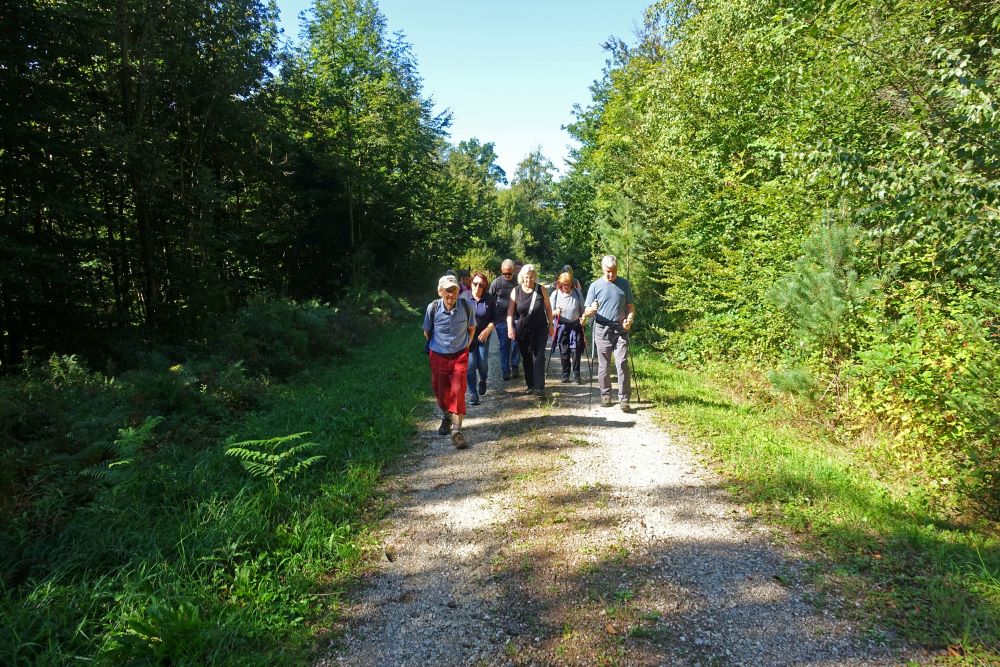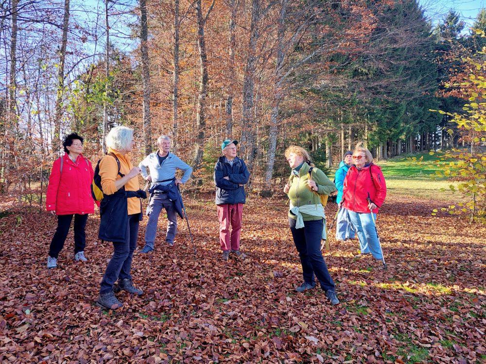 Auf dem Programm der Donnerstagswanderer stand eine Waldbegehung mit dem Revierleiter des Säckinger Stadtwaldes Gabriel Hieke. 18 Interessierte trafen sich am Bahnhof, Geburtstagskind Iris wurde mit einem Lied begrüßt dann ging durch den Badmattenpark, die Lindenallee und über die „Alte Bergseestraße“ zum oberen Parkplatz am Bergsee. Die Jubilarin gab eine Runde Williams-Likör aus, zum Aufwärmen genau richtig, die Temperaturen waren herbstlich kühl. Mit Förster Hieke und seinem Praktikanten ging auf die Exkursion. Eine große Überraschung, gleich zu Beginn – ein Schwarzstorch! Auch für den Förster war dies die erste Sichtung in seinem Revier. An ausgesuchten Standorten und mit eindrücklichen Schaubildern und Diagrammen erklärte uns Herr Hieke die Probleme, die die Klimaerwärmung für die Wälder bringt. Die interessierten Fragen der Teilnehmer und die angeregten Diskussionen zeigten, dass unser Wald allen am Herzen liegt. In diesem Sinne war es eine sehr gelungene Veranstaltung- großer Beifall und Dank an Herrn Heike.