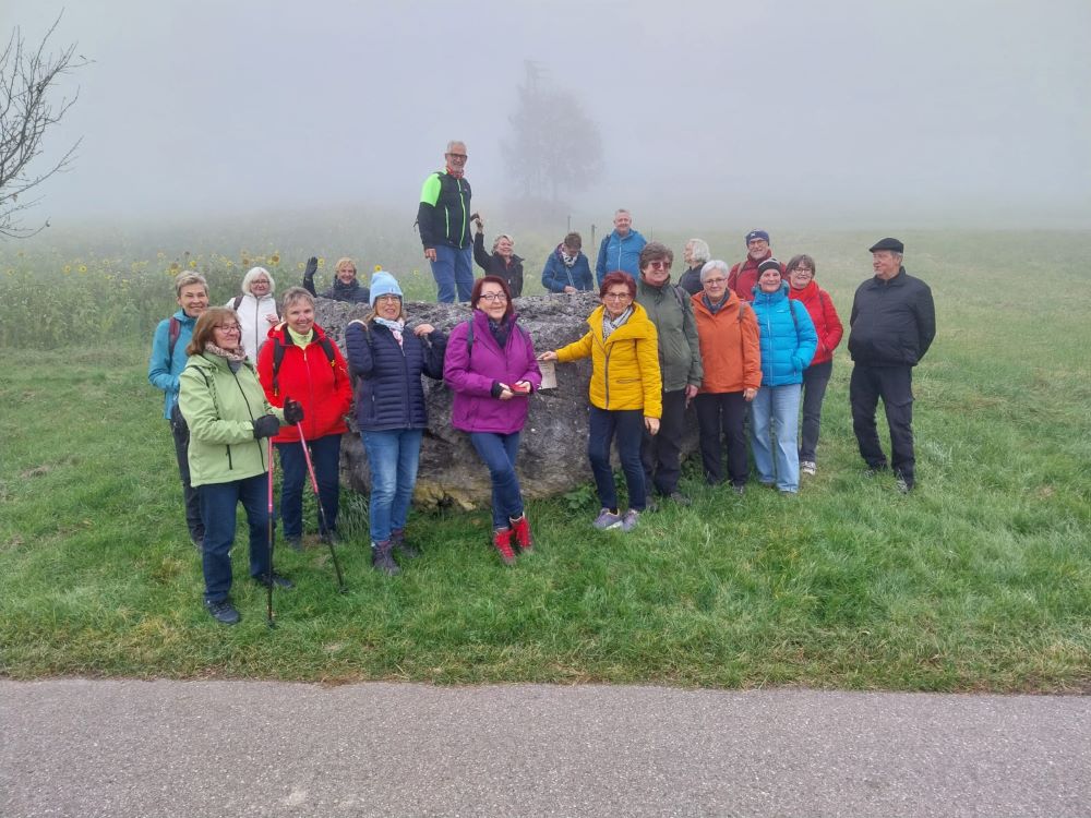 21 Donnerstagswanderer haben sich von Tiengen aus auf den ansteigenden Weg nach Breitenfeld begeben. Leider wurde uns der Panoramablick wegen Nebels diesmal verwehrt. Entschädigt wurden wir dann aber im Gasthaus Hirschen mit dem alljährlich Schlachtplattenessen. Gut gestärkt ging es dann auf den Rückweg nach Tiengen. Beim 1,8 Mio. Jahre alten Findling aus der Eiszeit wurde noch Aufstellung zum Gruppenfoto genommen. Wer erwartet hatte, dass sich der Nebel am Nachmittag auflöst, wurde leider enttäuscht. Trotz Nebels hat es aber allen bei der Tour gut gefallen.