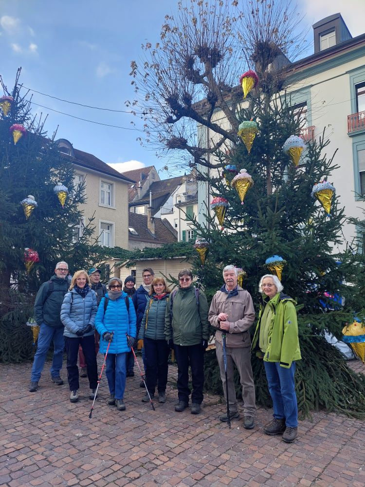 Vom Bahnhof in Rheinfelden ging es für 11 sportliche Wanderfreunde zunächst über die Brücke auf Schweizer Seite und dann durch die festlich geschmückte Altstadt von Rheinfelden/CH. Danach wurde der Wanderweg „Zeichenwald“ angesteuert. Anfangs war es noch recht kühl, später wurde es dann aber angenehm wärmer. Leider ist der „Zeichenwald“, der eigentlich ein Eichenwald ist, zu dieser Jahreszeit ziemlich kahl. Nach ausgiebiger Waldbegehung ging es zurück nach Rheinfelden ins Gasthaus „Dionysos“ (früher Café Paul), wo wir mit einem leckeren Essen beglückt wurden. Gut gestärkt ging es mit dem Zug wieder zurück in die Heimat.