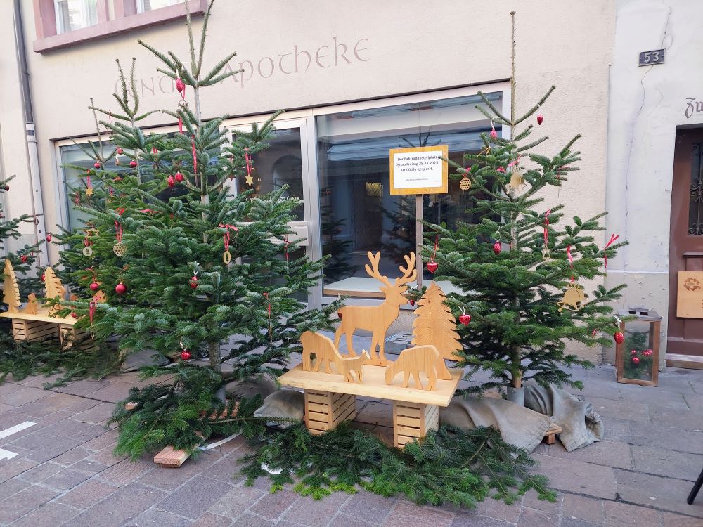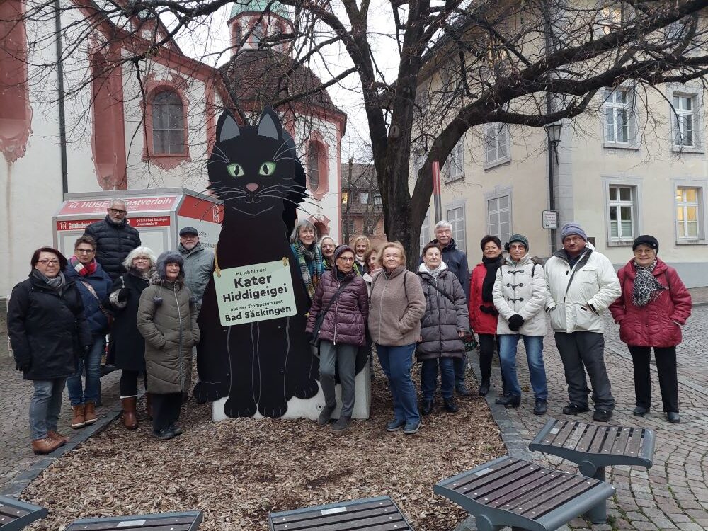 Ausnahmsweise einmal nachmittags ging es für 22 Wanderfreunde, darunter 2 Gastwanderer und unsere Vereinsvorsitzende Ingrid Bär, vom Bahnhof Bad Säckingen aus auf die „Kater Rallye“ durch unsere schöne Stadt. Am Bahnhofsplatz wurden zunächst 13 Stelen mit unterschiedlichen Katzendarstellungen begutachtet, darunter auch Kater Garfield. Von dort ging es weiter zur Geschichtsstele auf dem Rudolf-Eberle Platz, wo uns von Wanderführerin Renate einige Informationen dazu vermittelt wurden. Weiter ging es zum Gallusturm und über die Fischergasse zum Münsterplatz, wo ein Gruppenfoto mit dem Kater Hiddigeigei gemacht wurde. Nach einem kurzen Blick zum Fridolinmünster ging es zur Holzbrücke und daraufhin durch den festlich beleuchteten und geschmückten Schlosspark zum Narrenbrunnen. Nach all den Katzenbegutachten hatten alle Teilnehmer Hunger und Durst, der gestillt werden musste. Zunächst auf dem Weihnachtsmarkt und dann gab es noch leckeren Glühwein bei „Hofmanns Genusswelt“. Manche Wanderfreunde liesen es sich zum Abschluß noch im Festzelt gut gehen.