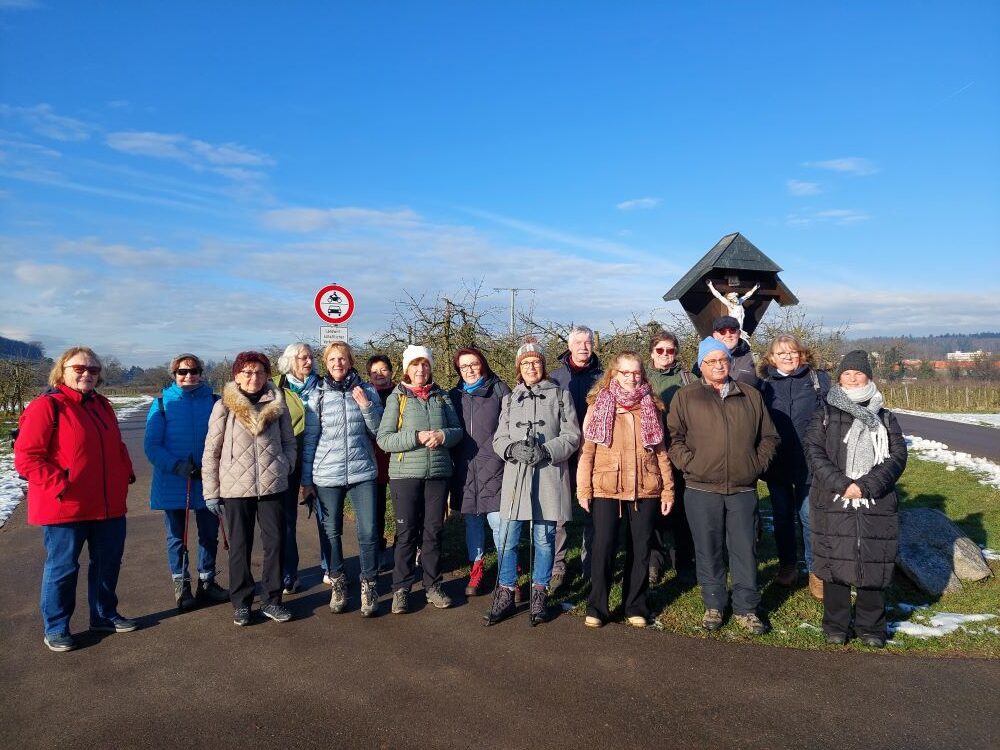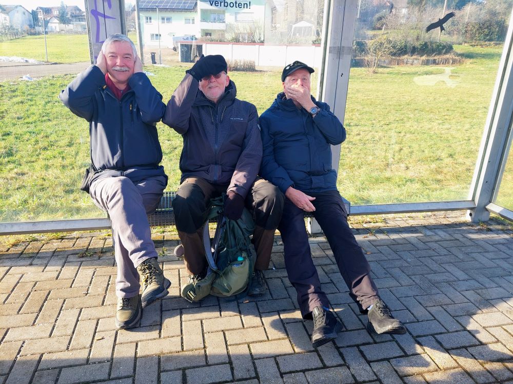 Zunächst ging es für 19 Wanderfreunde von Laufenburg aus am Rheinufer entlang in Richtung Stadenhausen. Eigentlich waren es nur 17, weil zwei Wanderfreundinnen infolge ihres vertieften Gesprächs im Bus übersehen hatten, dass die Anderen ausgestiegen waren. Wir haben uns dann aber wieder vor Stadenhausen wiedergefunden. Diese lustige Annektode wird bestimmt bei „Christophs Jahresrückblick“ noch einmal unsere Lachmuskeln beanspruchen. Gut gelaunt und nun auch mit Sonnenunterstützung ging es weiter zum Obsthof Bächle und von dort weiter nach Luttingen. Im Gasthaus Engel wurde gespeist und danach wieder die Heimreise mit dem Bus angetreten. Vor der Abfahrt wurde dann von drei Wanderern noch etwas Quatsch gemacht. (3 Affen)