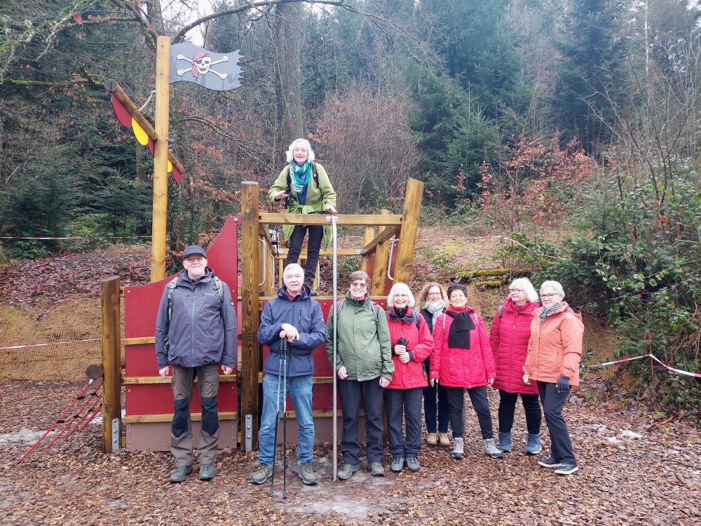 Zunächst ging es für 10 Wanderfreunde bei nasskaltem Wetter vom Bahnhof Bad Säckingen aus durch den Badmatten-Park zum Bergsee. Dort wurde erst einmal unter der Piraten-Flagge Aufstellung bezogen und anschließend ein Likörchen genossen. (Danke dafür Bärbel) Weiter ging es daraufhin nach Öflingen. Im dortigen Dorfladen wurde leckeres Gulasch verzehrt. Da sich dort auch eine Faschingsgruppe eingefunden hatte, wurden wir auch noch mit Musik versorgt. Gut gestärkt ging es mit dem Bus zurück in die Heimat, wo kurz nach unserem Eintreffen die „Wälder“ durch die Straßen zogen. Auch unsere Vereinsvorsitzende hat teilgenommen und uns mit leckeren Pralinen bedacht. Herzlichen Dank dafür.