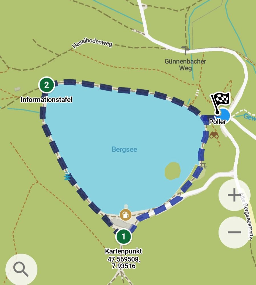 Die Bergseerunde beginnt in der Nähe des Scheffelfelsens und kann in beide Richtungen gegangen werden. Eine Einkehrmöglichkeit bietet das Bergsee-Restaurant. Wenn man nicht einkehren will, sollte man hinten um das Restaurant herumgehen, dann muss ein kleiner An- und Abstieg überwunden werden.