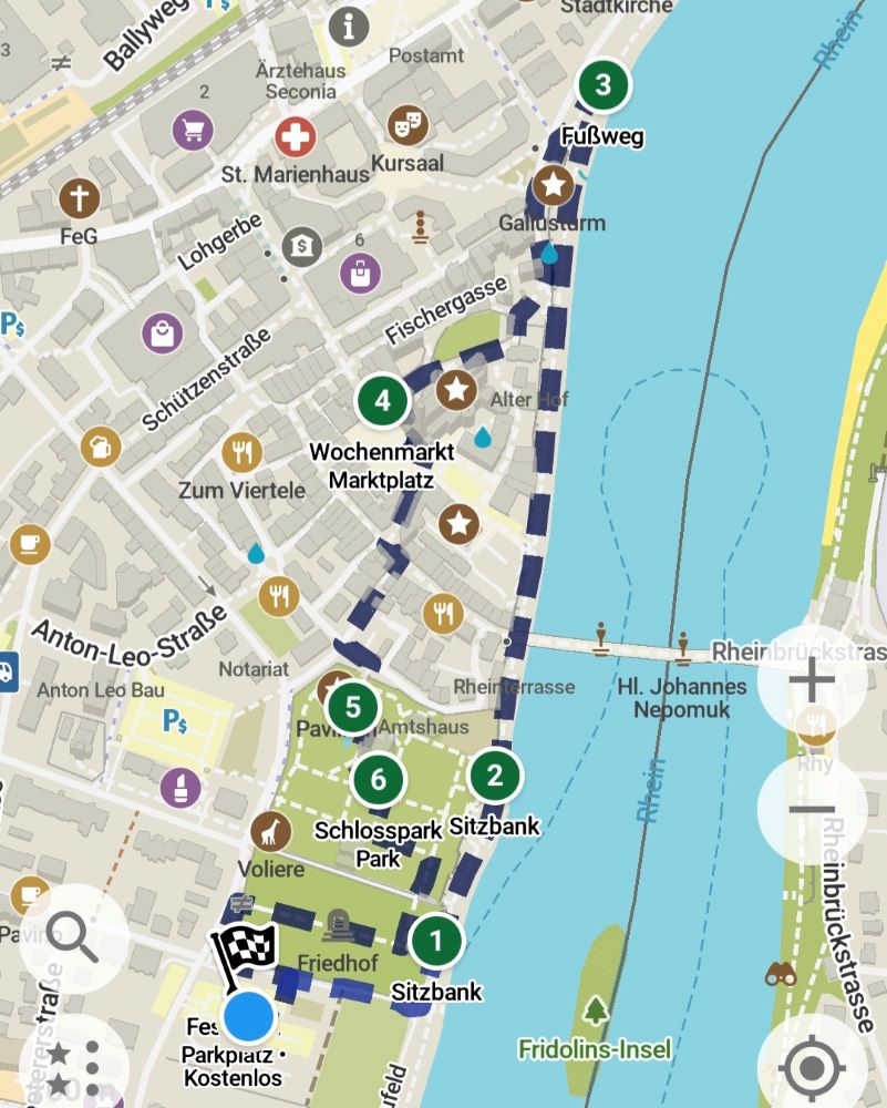 Vom festplatz aus geht es hinunter zum Rheinuferweg. Dieser führt uns direkt am Wasser entlang am Diebsturm vorbei und unter der Holzbrücke hindurch bis zum Gallusturm. Kurz danach biegen wir scharf links ab und gehen den asphaltierten Weg nach oben. Am Münster vorbei und über den Münsterplatz gelangt man in den Schlosspark. Hier gibt es zu jeder Jahreszeit etwas zu entdecken. Den Abschluss des Spaziegangs bildet ein Gang über den Aufriedhof. Von dort ist es nicht mehr weit bis zum Festplatz.